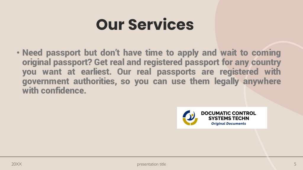 Our Services • Need passport but don’t have time to apply and wait to coming original passport? Get real and registered passport for any country you want at earliest. Our real passports are registered with government authorities, so you can use them legally anywhere with confidence. presentation title