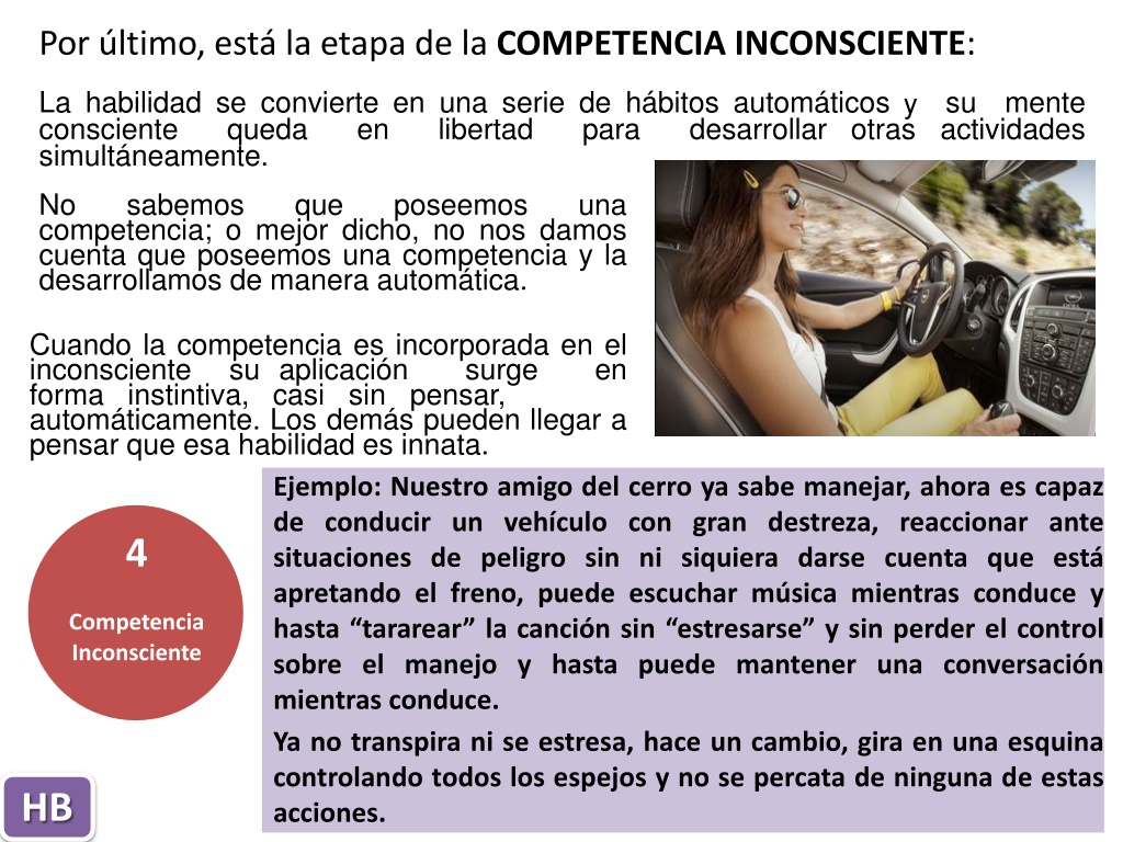 A continuación se llega a la etapa de la COMPETENCIA CONSCIENTE: En la medida que usted es capaz de hacerlo,peroaplicando atención yconcentración. Ejemplo: cuando el hombre que bajó del cerro empieza a aprender a manejar y se lanza a sus primeras prácticas se dice a sí mismo: “aprieto el embrague, pongo primera, miro por el espejo, giro el volante y voy soltando despacio el embrague para que el auto no se apague”. Es un proceso consciente que debe hacer para una operación que toma solo pocos segundos. Es posible que nuestro amigo que está aprendiendo a manejar, transpire y se agote mentalmente con tantas cosas que debe procesar y aplicar al mismo tiempo, es posible también que desee que la radio esté apagada y que nadie le hable o lo distraiga. A medida que vamos adquiriendo una competencianecesitamos estar conscientes de cada cosa que hacemospara afianzar dicha competencia. Cadapasoesinternalizadoytransmitidoalcerebro,paraque reténgala técnica y luego vuelva a repetirla 3 Competencia Consciente HB