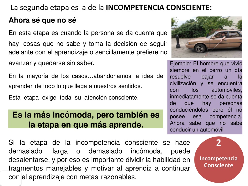 Lasegunda etapaesla delaINCOMPETENCIACONSCIENTE: Ahoraséquenosé En esta etapa es cuando la persona se da cuenta que haycosas que no sabe y toma la decisión de seguir adelante con el aprendizaje o sencillamente prefiere no avanzar y quedarse sin saber. Ejemplo: El hombre que vivió siempre en el cerro un día resuelve bajar a la civilización y se encuentra con los automóviles, inmediatamente se da cuenta de que hay personas conduciéndolos pero él no posee esa competencia. Ahora sabe que no sabe conducir un automóvil En la mayoría de los casos…abandonamos la idea de aprenderde todo lo que llega a nuestros sentidos. Esta etapa exige toda su atención consciente. Es la más incómoda, pero también es la etapa en que más aprende. Si la etapa de la incompetencia consciente se hace demasiadolarga o demasiado incómoda, puede desalentarse, y por eso es importante dividir la habilidad en fragmentos manejables y motivar al aprendiz a continuar con el aprendizaje con metasrazonables. 2 Incompetencia Consciente