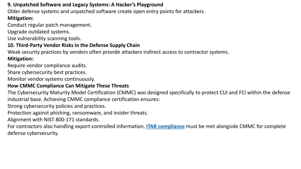 9. Unpatched Software and Legacy Systems: A Hacker’s Playground Older defense systems and unpatched software create open entry points for attackers. Mitigation: Conduct regular patch management. Upgrade outdated systems. Use vulnerability scanning tools. 10. Third-Party Vendor Risks in the Defense Supply Chain Weak security practices by vendors often provide attackers indirect access to contractor systems. Mitigation: Require vendor compliance audits. Share cybersecurity best practices. Monitor vendor systems continuously. How CMMC Compliance Can Mitigate These Threats The Cybersecurity Maturity Model Certification (CMMC) was designed specifically to protect CUI and FCI within the defense industrial base. Achieving CMMC compliance certification ensures: Strong cybersecurity policies and practices. Protection against phishing, ransomware, and insider threats. Alignment with NIST 800-171 standards. For contractors also handling export-controlled information, ITAR compliance must be met alongside CMMC for complete defense cybersecurity.