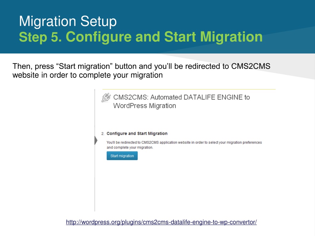 Migration SetupStep 5. Configure and Start Migration Then, press “Start migration” button and you’ll be redirected to CMS2CMS website in order to complete your migration http://wordpress.org/plugins/cms2cms-datalife-engine-to-wp-convertor/