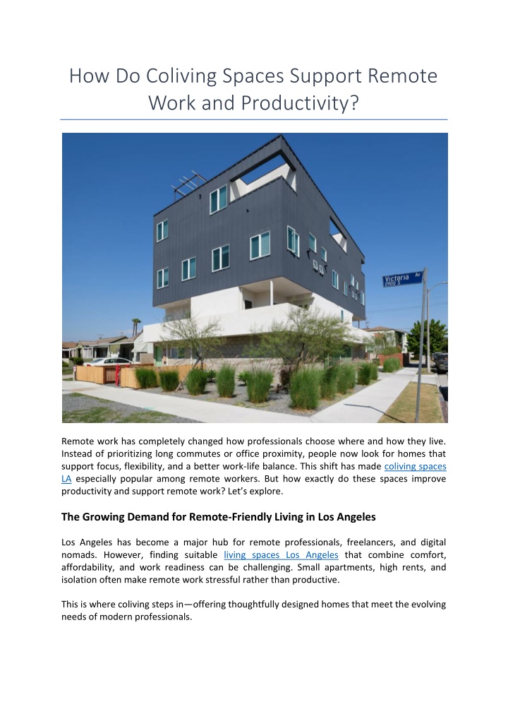 communal kitchens. These features make it easier to separate work time from personal time. For remote professionals in living spaces Los Angeles, this balance is essential for avoiding burnout and maintaining long-term performance. Cost-Effective Living without Compromising Quality Los Angeles is known for high housing costs, but coliving offers a more affordable alternative without sacrificing quality. By sharing resources, residents gain access to premium locations and amenities at a lower cost than traditional rentals. This makes coliving spaces LA especially attractive to freelancers, startups, and professionals relocating to the city. Who Benefits Most from Remote-Friendly Coliving? Coliving is ideal for: Remote employees and freelancers Entrepreneurs and startup founders Digital nomads and creative’s Professionals new to Los Angeles