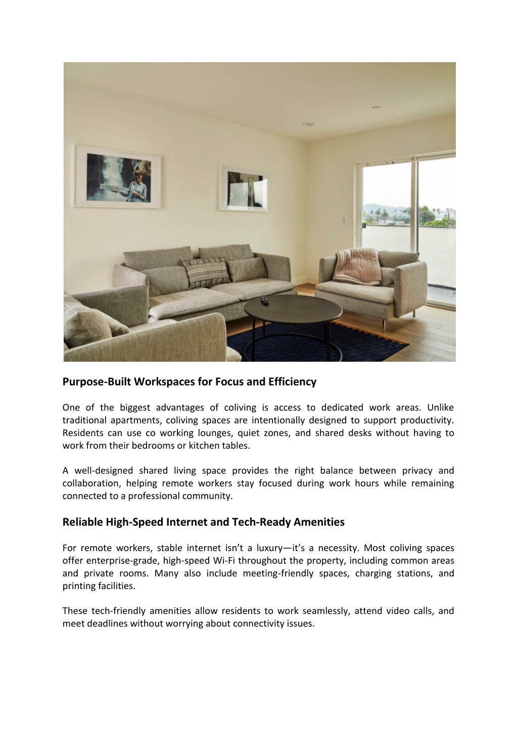 Purpose-Built Workspaces for Focus and Efficiency One of the biggest advantages of coliving is access to dedicated work areas. Unlike traditional apartments, coliving spaces are intentionally designed to support productivity. Residents can use co working lounges, quiet zones, and shared desks without having to work from their bedrooms or kitchen tables. A well-designed shared living space provides the right balance between privacy and collaboration, helping remote workers stay focused during work hours while remaining connected to a professional community. Reliable High-Speed Internet and Tech-Ready Amenities For remote workers, stable internet isn’t a luxury—it’s a necessity. Most coliving spaces offer enterprise-grade, high-speed Wi-Fi throughout the property, including common areas and private rooms. Many also include meeting-friendly spaces, charging stations, and printing facilities. These tech-friendly amenities allow residents to work seamlessly, attend video calls, and meet deadlines without worrying about connectivity issues.