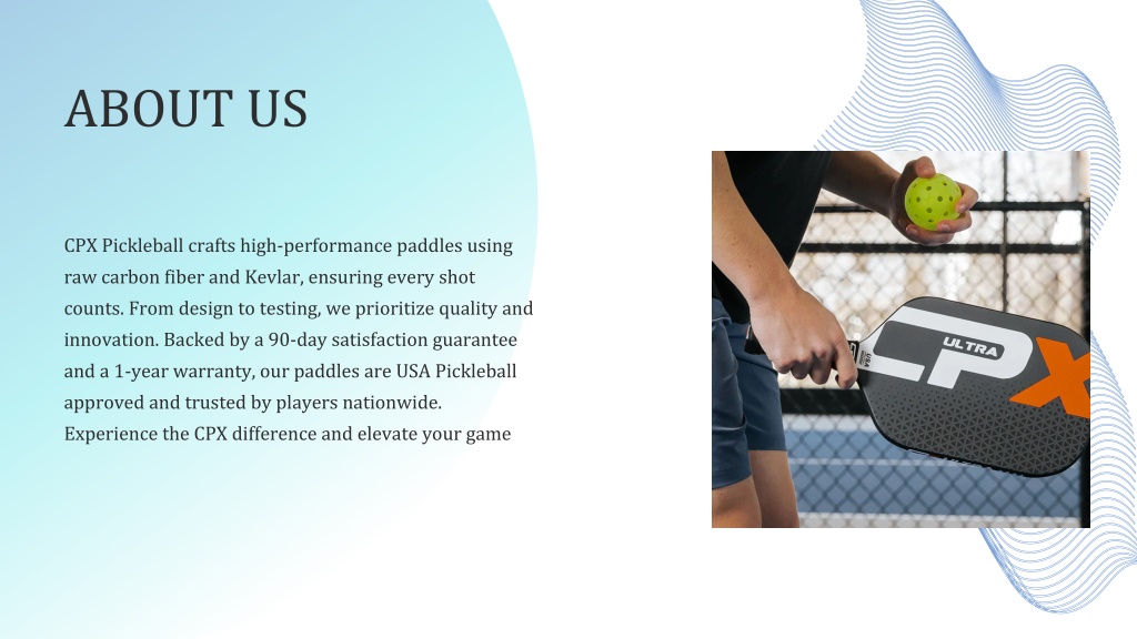 ABOUT US CPX Pickleball crafts high-performance paddles using raw carbon fiber and Kevlar, ensuring every shot counts. From design to testing, we prioritize quality and innovation. Backed by a 90-day satisfaction guarantee and a 1-year warranty, our paddles are USA Pickleball approved and trusted by players nationwide. Experience the CPX difference and elevate your game