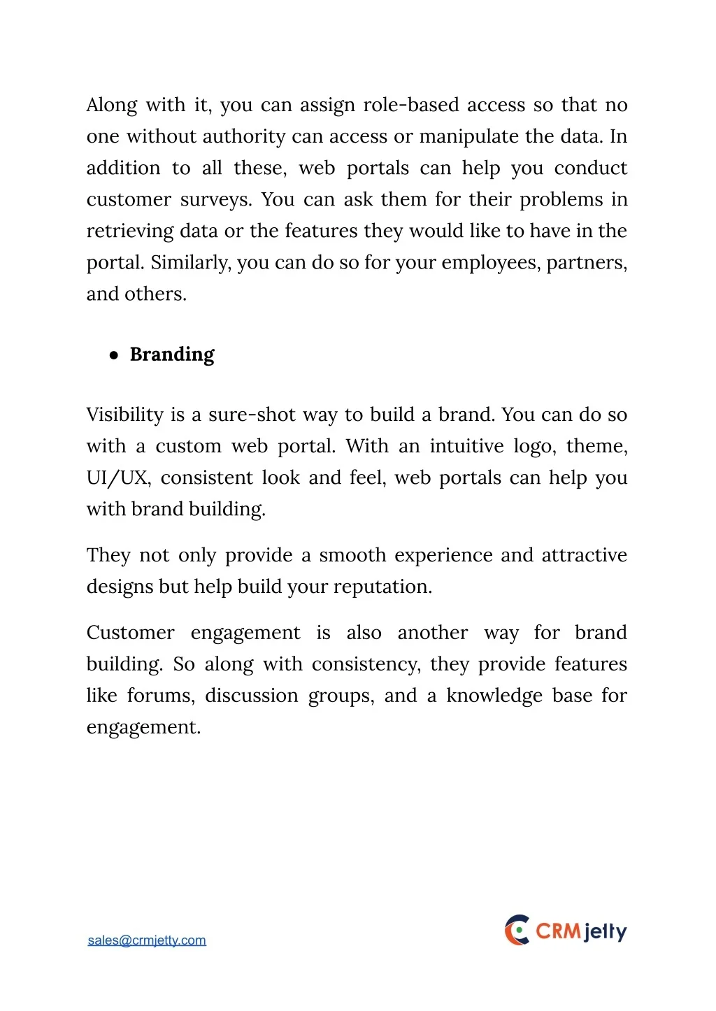 Along with it, you can assign role-based access so that no one without authority can access or manipulate the data. In addition to all these, web portals can help you conduct customer surveys. You can ask them for their problems in retrieving data or the features they would like to have in the portal. Similarly, you can do so for your employees, partners, and others. ● Branding Visibility is a sure-shot way to build a brand. You can do so with a custom web portal. With an intuitive logo, theme, UI/UX, consistent look and feel, web portals can help you with brand building. They not only provide a smooth experience and attractive designs but help build your reputation. Customer engagement is also another way for brand building. So along with consistency, they provide features like forums, discussion groups, and a knowledge base for engagement. sales@crmjetty.com