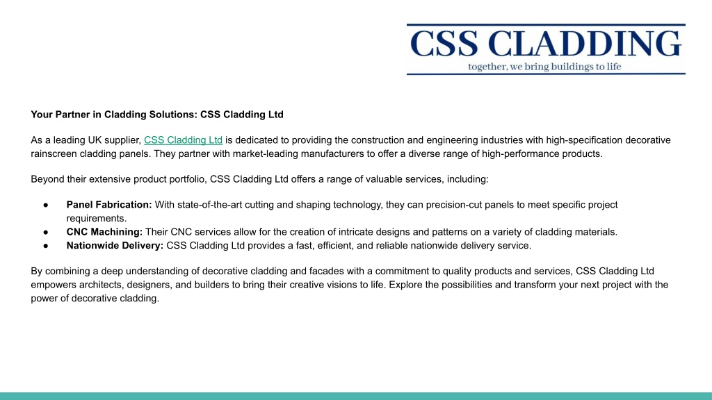 5. Your Partner in Cladding Solutions: CSS Cladding Ltd As a leading UK supplier, CSS Cladding Ltd is dedicated to providing the construction and engineering industries with high-specification decorative rainscreen cladding panels. They partner with market-leading manufacturers to offer a diverse range of high-performance products. Beyond their extensive product portfolio, CSS Cladding Ltd offers a range of valuable services, including: ● Panel Fabrication: With state-of-the-art cutting and shaping technology, they can precision-cut panels to meet specific project requirements. CNC Machining: Their CNC services allow for the creation of intricate designs and patterns on a variety of cladding materials. Nationwide Delivery: CSS Cladding Ltd provides a fast, efficient, and reliable nationwide delivery service. ● ● By combining a deep understanding of decorative cladding and facades with a commitment to quality products and services, CSS Cladding Ltd empowers architects, designers, and builders to bring their creative visions to life. Explore the possibilities and transform your next project with the power of decorative cladding.