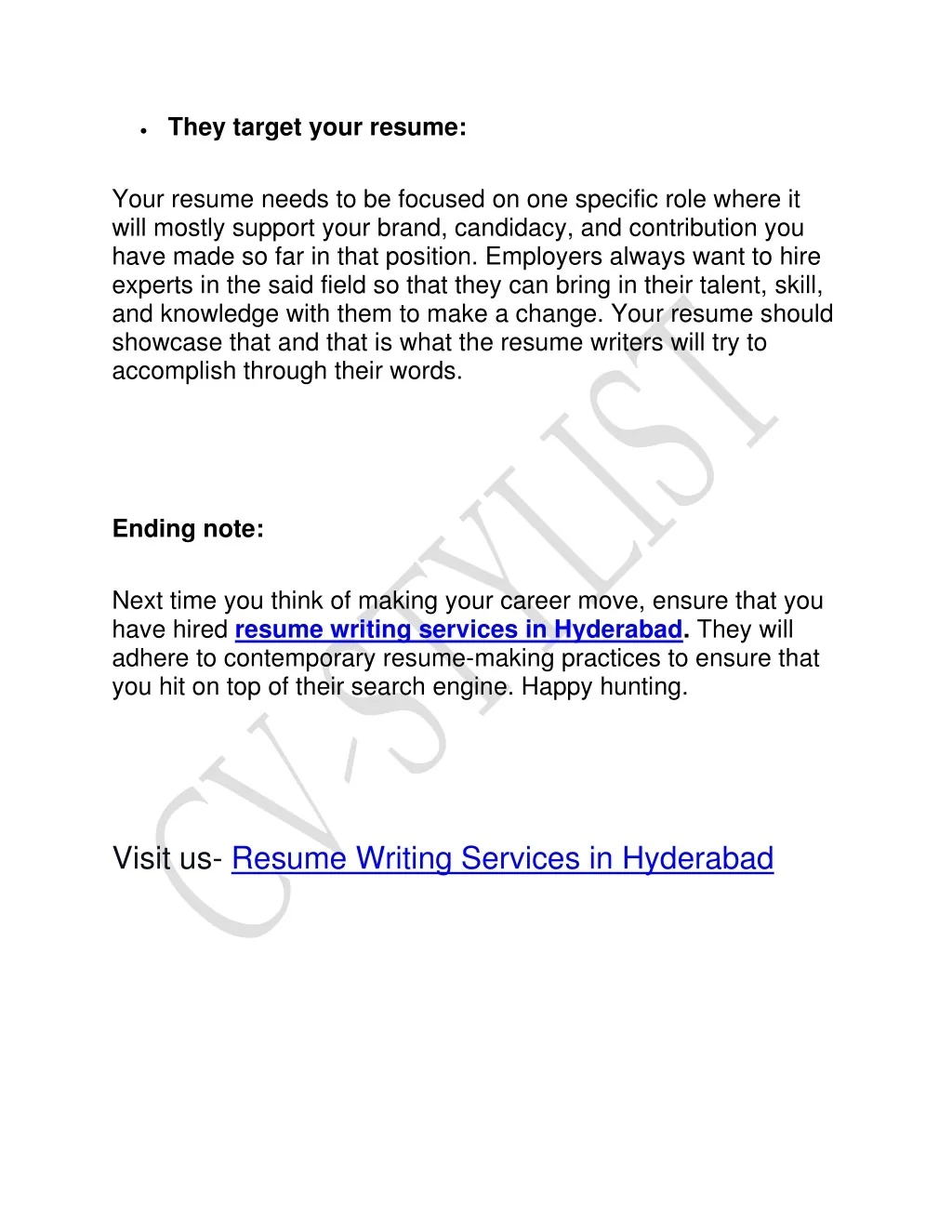 •They target your resume: Your resume needs to be focused on one specific role where it will mostly support your brand, candidacy, and contribution you have made so far in that position. Employers always want to hire experts in the said field so that they can bring in their talent, skill, and knowledge with them to make a change. Your resume should showcase that and that is what the resume writers will try to accomplish through their words. Ending note: Next time you think of making your career move, ensure that you have hired resume writing services in Hyderabad. They will adhere to contemporary resume-making practices to ensure that you hit on top of their search engine. Happy hunting. Visit us- Resume Writing Services in Hyderabad