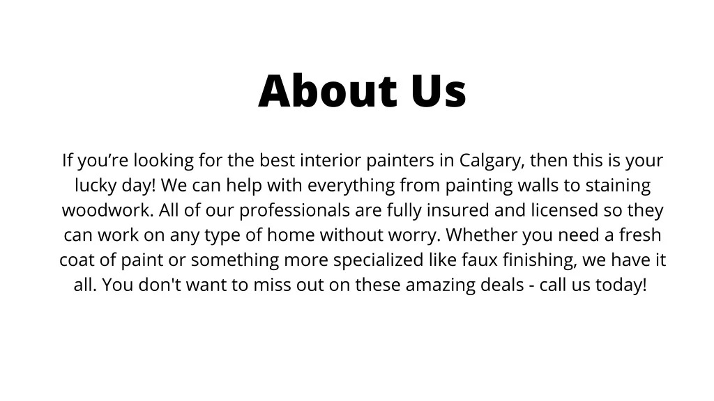 About Us If you’re looking for the best interior painters in Calgary, then this is your lucky day! We can help with everything from painting walls to staining woodwork. All of our professionals are fully insured and licensed so they can work on any type of home without worry. Whether you need a fresh coat of paint or something more specialized like faux finishing, we have it all. You don't want to miss out on these amazing deals - call us today!