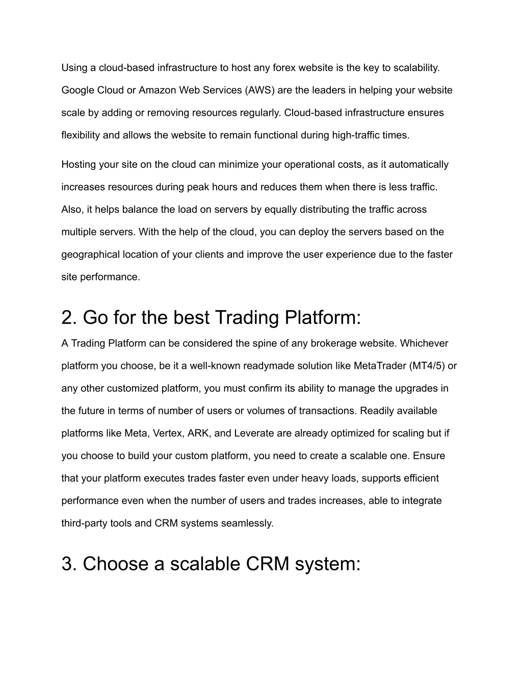 Building a Forex Brokerage Website with Scalability in Mind As the market of Forex Trading is tremendously populated and tends to increase in size day by day, for any broker to sustain in this highly competitive environment, having an outstanding brokerage website is a basic requirement. The definition of a forex website is not limited to providing a platform for trading but much beyond that. A successful brokerage website must handle increasing traffic, provide a hassle-free user experience, and incorporate multiple solutions to remain stable in this volatile market. Moreover, a forex website should have the capacity to scale in the future as per the market demands. In this blog, we would like to describe certain key factors that would be necessary for your website to scale efficiently along with your business. 1. Host your site on the cloud: