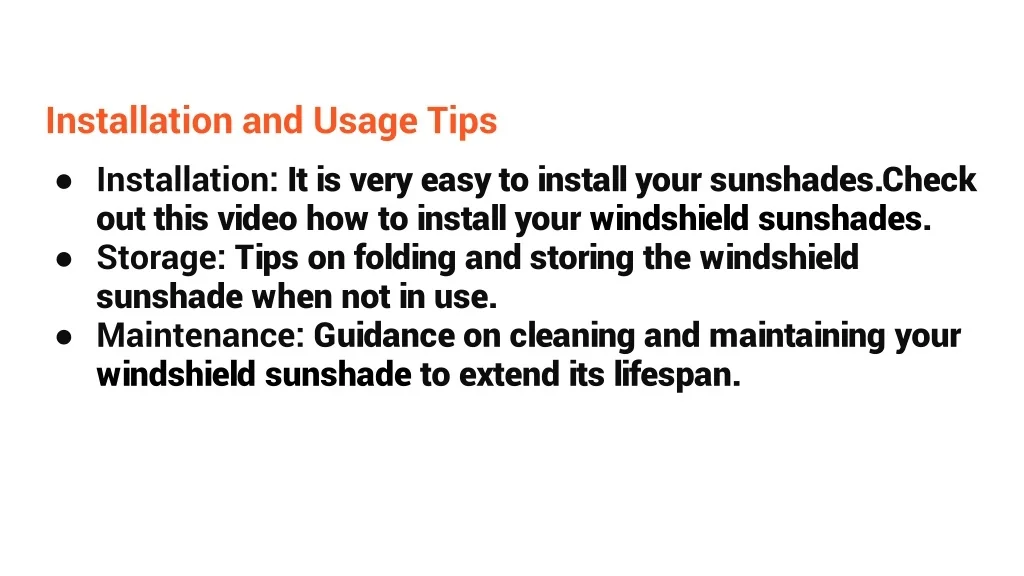 Installation and Usage Tips • Installation: It is very easy to install your sunshades.Check out this video how to install your windshield sunshades. • Storage: Tips on folding and storing the windshield sunshade when not in use. • Maintenance: Guidance on cleaning and maintaining your windshield sunshade to extend its lifespan.