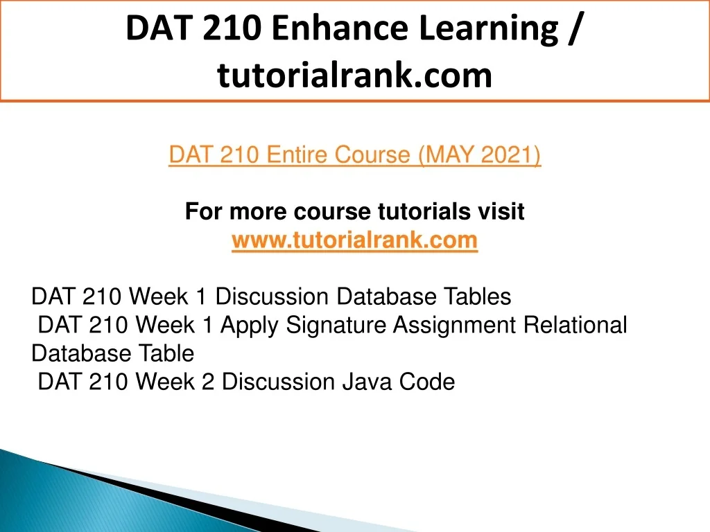 DAT 210 Enhance Learning / tutorialrank.com DAT 210 Entire Course (MAY 2021) For more course tutorials visit www.tutorialrank.com DAT 210 Week 1 Discussion Database Tables DAT 210 Week 1 Apply Signature Assignment Relational Database Table DAT 210 Week 2 Discussion Java Code