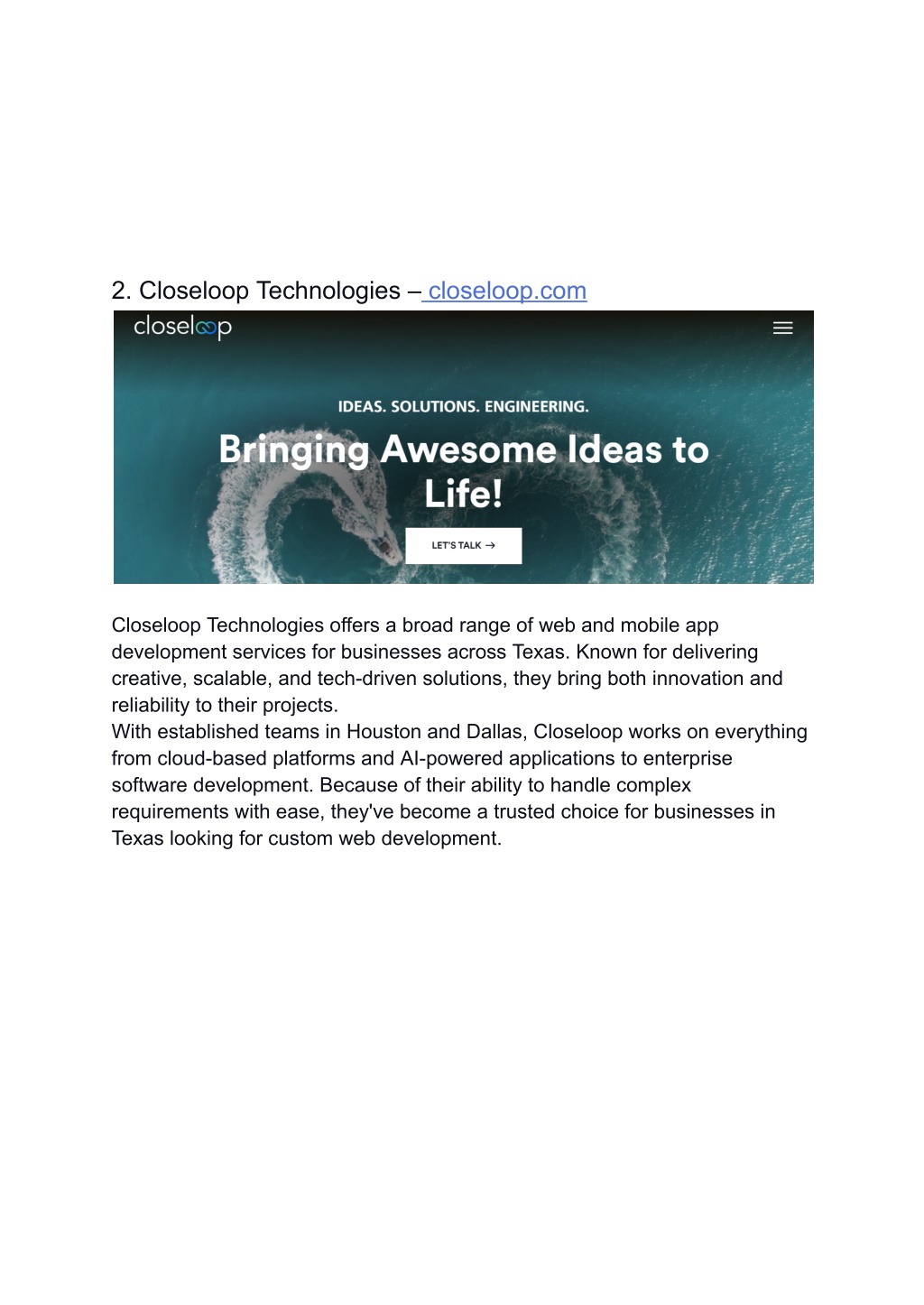 2. Closeloop Technologies – closeloop.com Closeloop Technologies offers a broad range of web and mobile app development services for businesses across Texas. Known for delivering creative, scalable, and tech-driven solutions, they bring both innovation and reliability to their projects. With established teams in Houston and Dallas, Closeloop works on everything from cloud-based platforms and AI-powered applications to enterprise software development. Because of their ability to handle complex requirements with ease, they've become a trusted choice for businesses in Texas looking for custom web development.