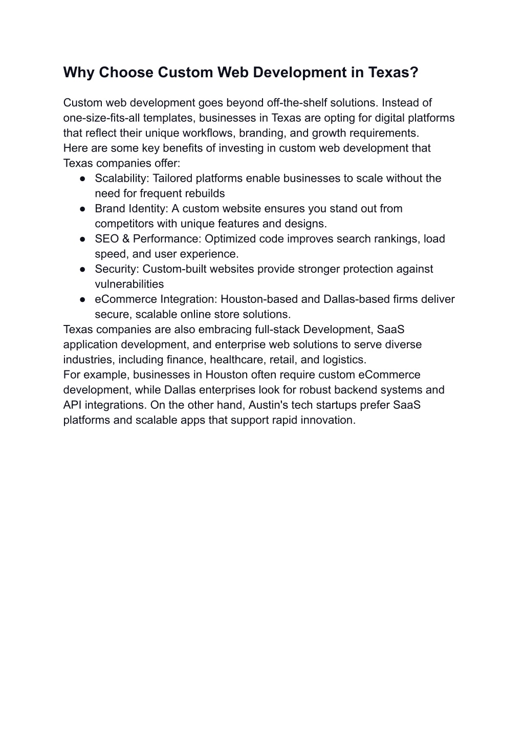 Why Choose Custom Web Development in Texas? Custom web development goes beyond off-the-shelf solutions. Instead of one-size-fits-all templates, businesses in Texas are opting for digital platforms that reflect their unique workflows, branding, and growth requirements. Here are some key benefits of investing in custom web development that Texas companies offer: ● Scalability: Tailored platforms enable businesses to scale without the need for frequent rebuilds ● Brand Identity: A custom website ensures you stand out from competitors with unique features and designs. ● SEO & Performance: Optimized code improves search rankings, load speed, and user experience. ● Security: Custom-built websites provide stronger protection against vulnerabilities ● eCommerce Integration: Houston-based and Dallas-based firms deliver secure, scalable online store solutions. Texas companies are also embracing full-stack Development, SaaS application development, and enterprise web solutions to serve diverse industries, including finance, healthcare, retail, and logistics. For example, businesses in Houston often require custom eCommerce development, while Dallas enterprises look for robust backend systems and API integrations. On the other hand, Austin's tech startups prefer SaaS platforms and scalable apps that support rapid innovation.
