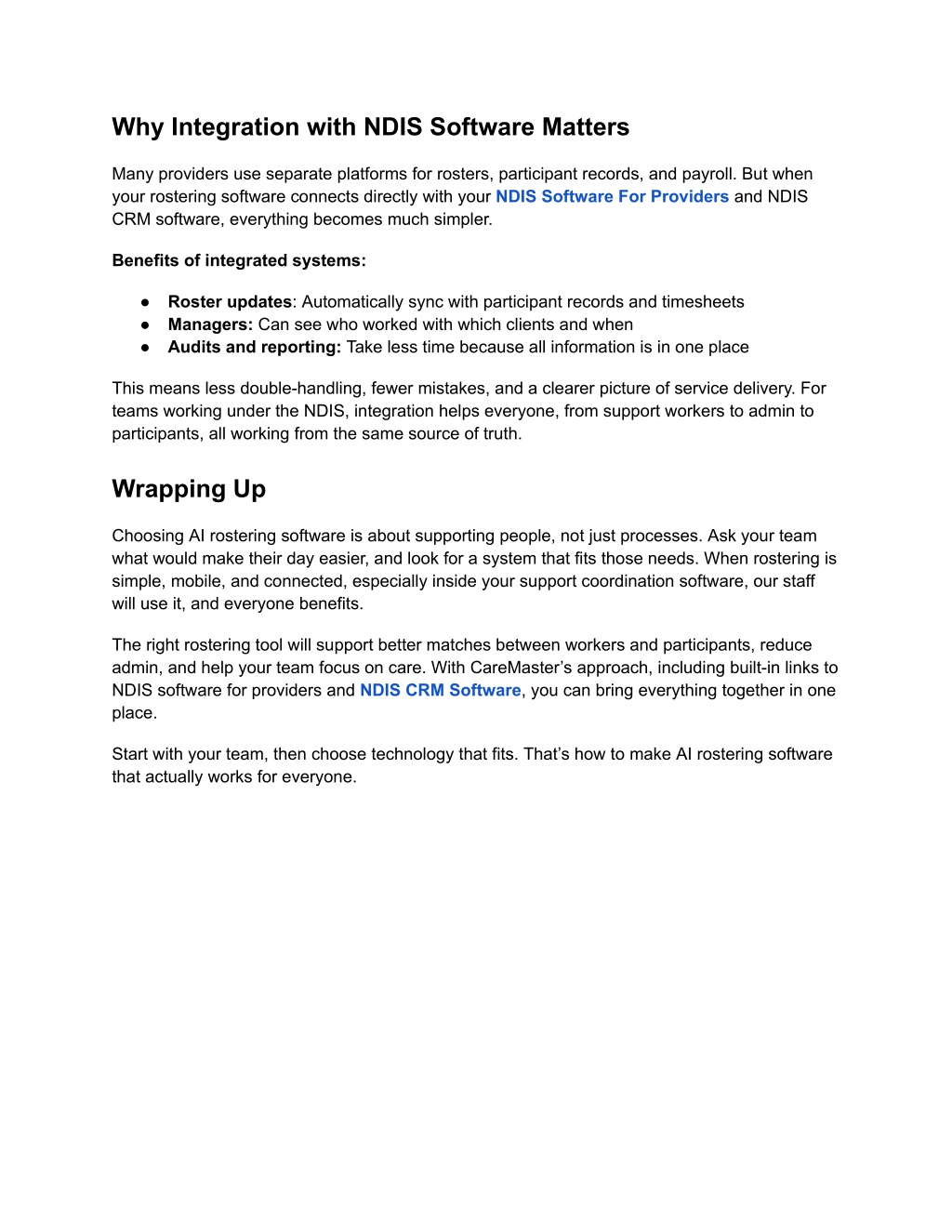 Why Integration with NDIS Software Matters Many providers use separate platforms for rosters, participant records, and payroll. But when your rostering software connects directly with your NDIS Software For Providers and NDIS CRM software, everything becomes much simpler. Benefits of integrated systems: ● Roster updates: Automatically sync with participant records and timesheets ● Managers: Can see who worked with which clients and when ● Audits and reporting: Take less time because all information is in one place This means less double-handling, fewer mistakes, and a clearer picture of service delivery. For teams working under the NDIS, integration helps everyone, from support workers to admin to participants, all working from the same source of truth. Wrapping Up Choosing AI rostering software is about supporting people, not just processes. Ask your team what would make their day easier, and look for a system that fits those needs. When rostering is simple, mobile, and connected, especially inside your support coordination software, our staff will use it, and everyone benefits. The right rostering tool will support better matches between workers and participants, reduce admin, and help your team focus on care. With CareMaster’s approach, including built-in links to NDIS software for providers and NDIS CRM Software, you can bring everything together in one place. Start with your team, then choose technology that fits. That’s how to make AI rostering software that actually works for everyone.
