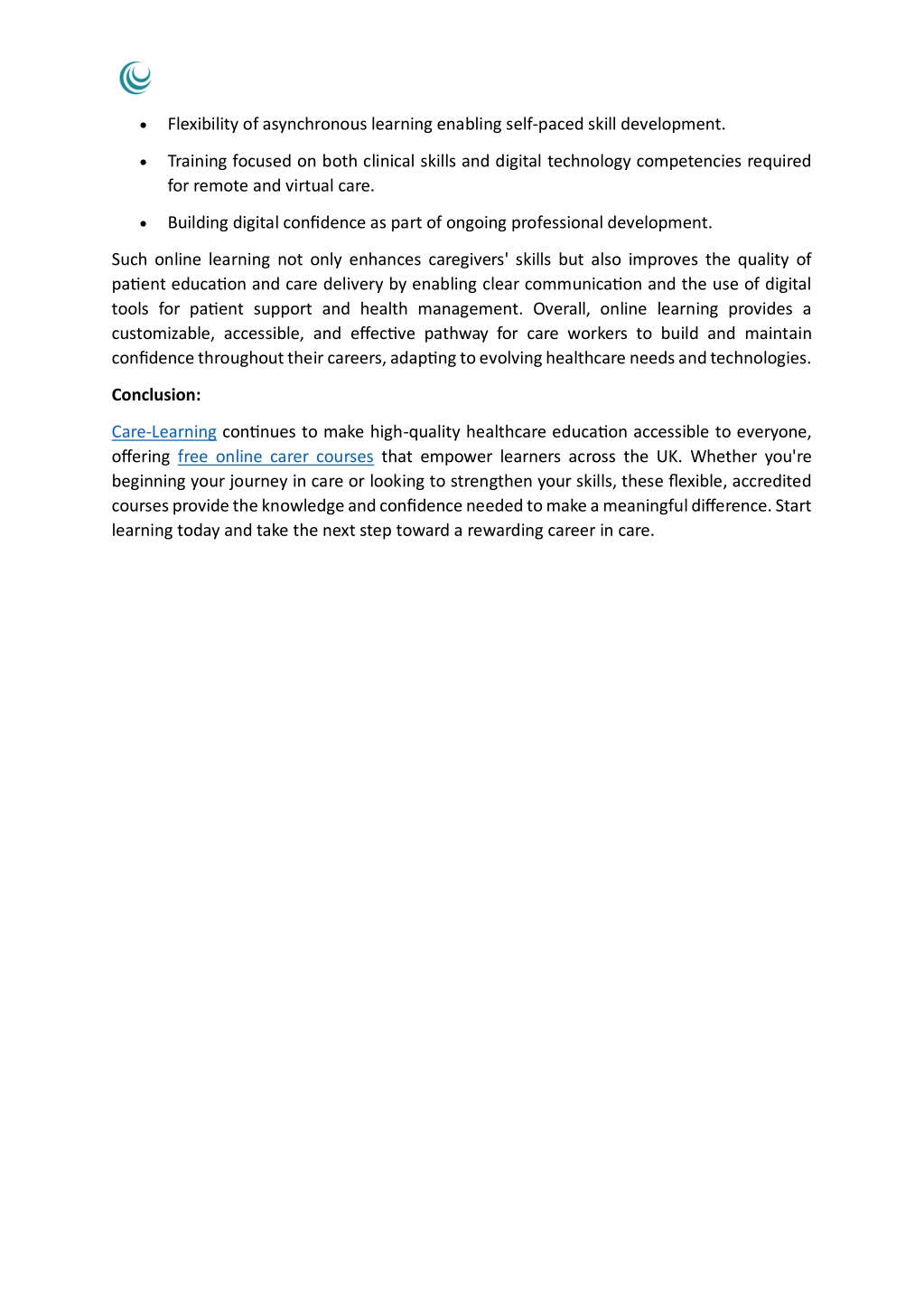 2. Flexibility of asynchronous learning enabling self-paced skill development. Training focused on both clinical skills and digital technology competencies required for remote and virtual care. Building digital confidence as part of ongoing professional development. Such online learning not only enhances caregivers' skills but also improves the quality of patient education and care delivery by enabling clear communication and the use of digital tools for patient support and health management. Overall, online learning provides a customizable, accessible, and effective pathway for care workers to build and maintain confidence throughout their careers, adapting to evolving healthcare needs and technologies. Conclusion: Care-Learning continues to make high-quality healthcare education accessible to everyone, offering free online carer courses that empower learners across the UK. Whether you're beginning your journey in care or looking to strengthen your skills, these flexible, accredited courses provide the knowledge and confidence needed to make a meaningful difference. Start learning today and take the next step toward a rewarding career in care.