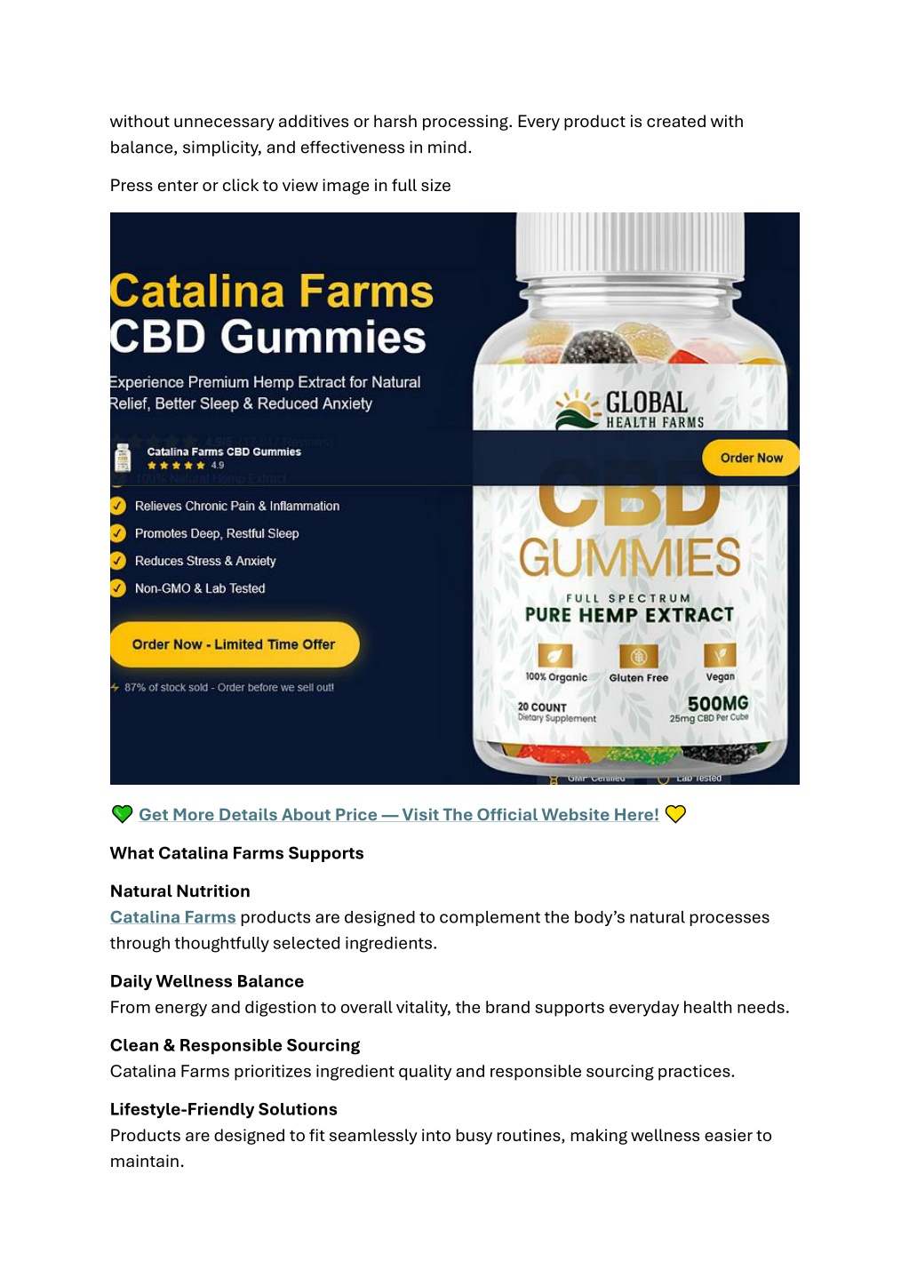 without unnecessary additives or harsh processing. Every product is created with balance, simplicity, and effectiveness in mind. Press enter or click to view image in full size Get More Details About Price — Visit The Official Website Here! What Catalina Farms Supports Natural Nutrition Catalina Farmsproducts are designed to complement the body’s natural processes through thoughtfully selected ingredients. Daily Wellness Balance From energy and digestion to overall vitality, the brand supports everyday health needs. Clean & Responsible Sourcing Catalina Farms prioritizes ingredient quality and responsible sourcing practices. Lifestyle-Friendly Solutions Products are designed to fit seamlessly into busy routines, making wellness easier to maintain.