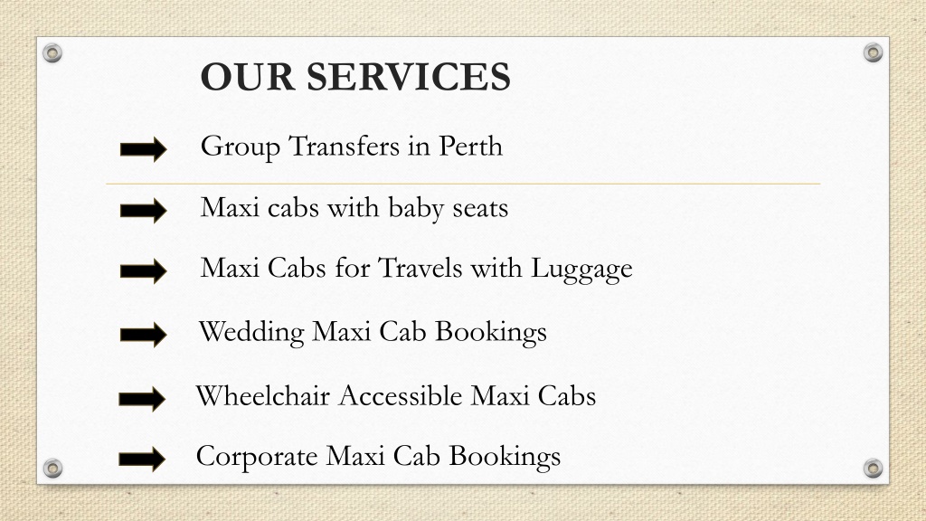 OUR SERVICES Group Transfers in Perth Maxi cabs with baby seats Maxi Cabs for Travels with Luggage Wedding Maxi Cab Bookings Wheelchair Accessible Maxi Cabs Corporate Maxi Cab Bookings