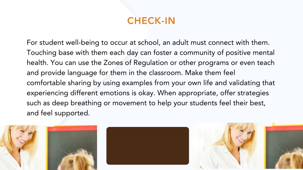 CHECK-IN For student well-being to occur at school, an adult must connect with them. Touching base with them each day can foster a community of positive mental health. You can use the Zones of Regulation or other programs or even teach and provide language for them in the classroom. Make them feel comfortable sharing by using examples from your own life and validating that experiencing different emotions is okay. When appropriate, offer strategies such as deep breathing or movement to help your students feel their best, and feel supported.