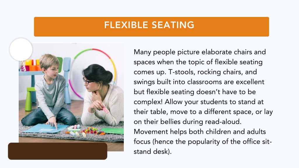 FLEXIBLE SEATING Many people picture elaborate chairs and spaces when the topic of flexible seating comes up. T-stools, rocking chairs, and swings built into classrooms are excellent but flexible seating doesn’t have to be complex! Allow your students to stand at their table, move to a different space, or lay on their bellies during read-aloud. Movement helps both children and adults focus (hence the popularity of the office sit-stand desk).