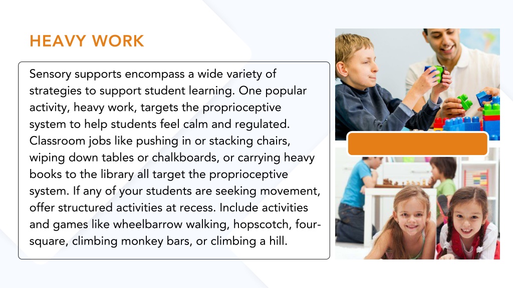 HEAVY WORK Sensory supports encompass a wide variety of strategies to support student learning. One popular activity, heavy work, targets the proprioceptive system to help students feel calm and regulated. Classroom jobs like pushing in or stacking chairs, wiping down tables or chalkboards, or carrying heavy books to the library all target the proprioceptive system. If any of your students are seeking movement, offer structured activities at recess. Include activities and games like wheelbarrow walking, hopscotch, four-square, climbing monkey bars, or climbing a hill.