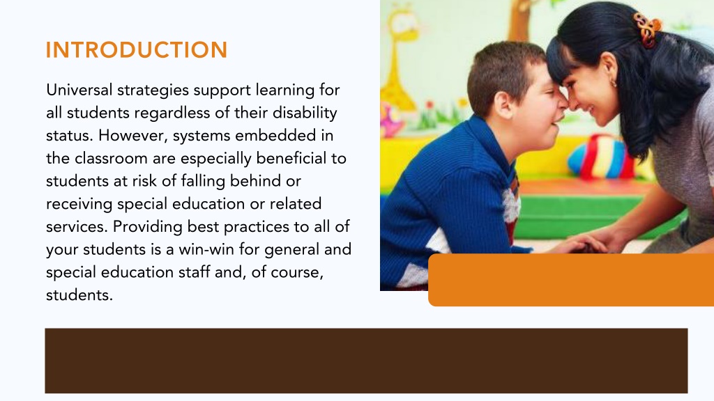 INTRODUCTION Universal strategies support learning for all students regardless of their disability status. However, systems embedded in the classroom are especially beneficial to students at risk of falling behind or receiving special education or related services. Providing best practices to all of your students is a win-win for general and special education staff and, of course, students.