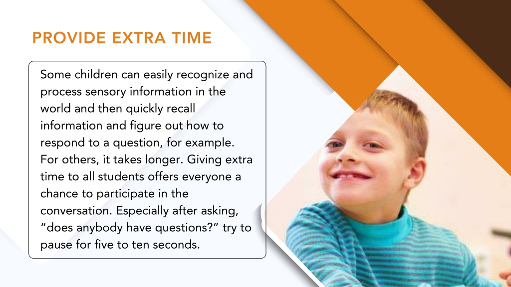 PROVIDE EXTRA TIME Some children can easily recognize and process sensory information in the world and then quickly recall information and figure out how to respond to a question, for example. For others, it takes longer. Giving extra time to all students offers everyone a chance to participate in the conversation. Especially after asking, “does anybody have questions?” try to pause for five to ten seconds.