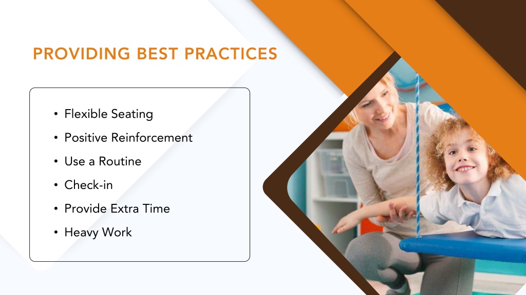 PROVIDING BEST PRACTICES • Flexible Seating • Positive Reinforcement • Use a Routine • Check-in • Provide Extra Time • Heavy Work