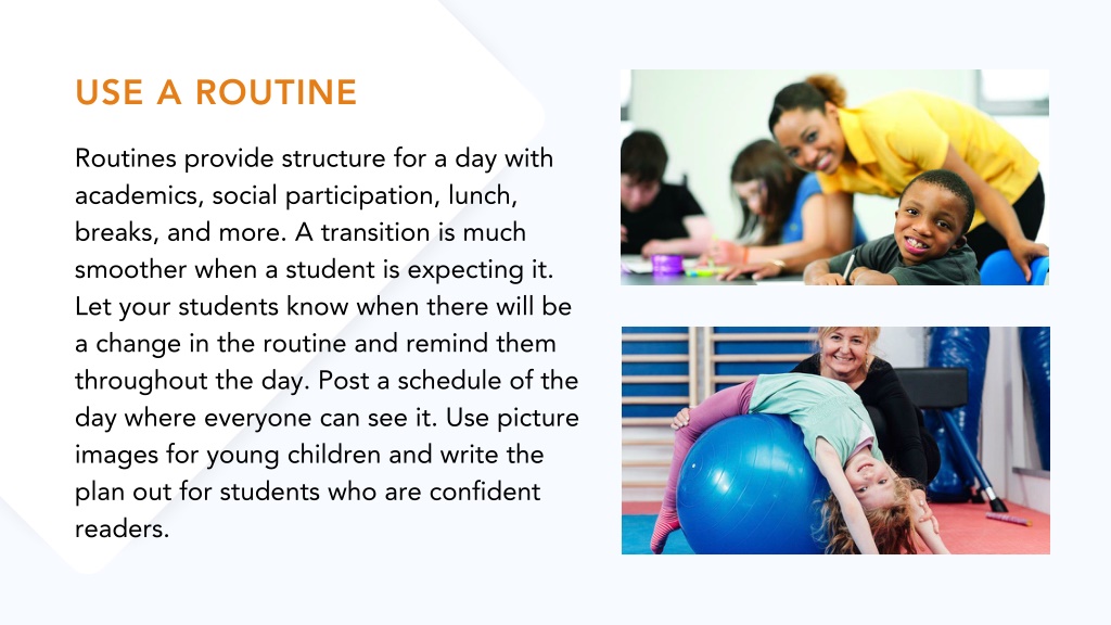 USE A ROUTINE Routines provide structure for a day with academics, social participation, lunch, breaks, and more. A transition is much smoother when a student is expecting it. Let your students know when there will be a change in the routine and remind them throughout the day. Post a schedule of the day where everyone can see it. Use picture images for young children and write the plan out for students who are confident readers.