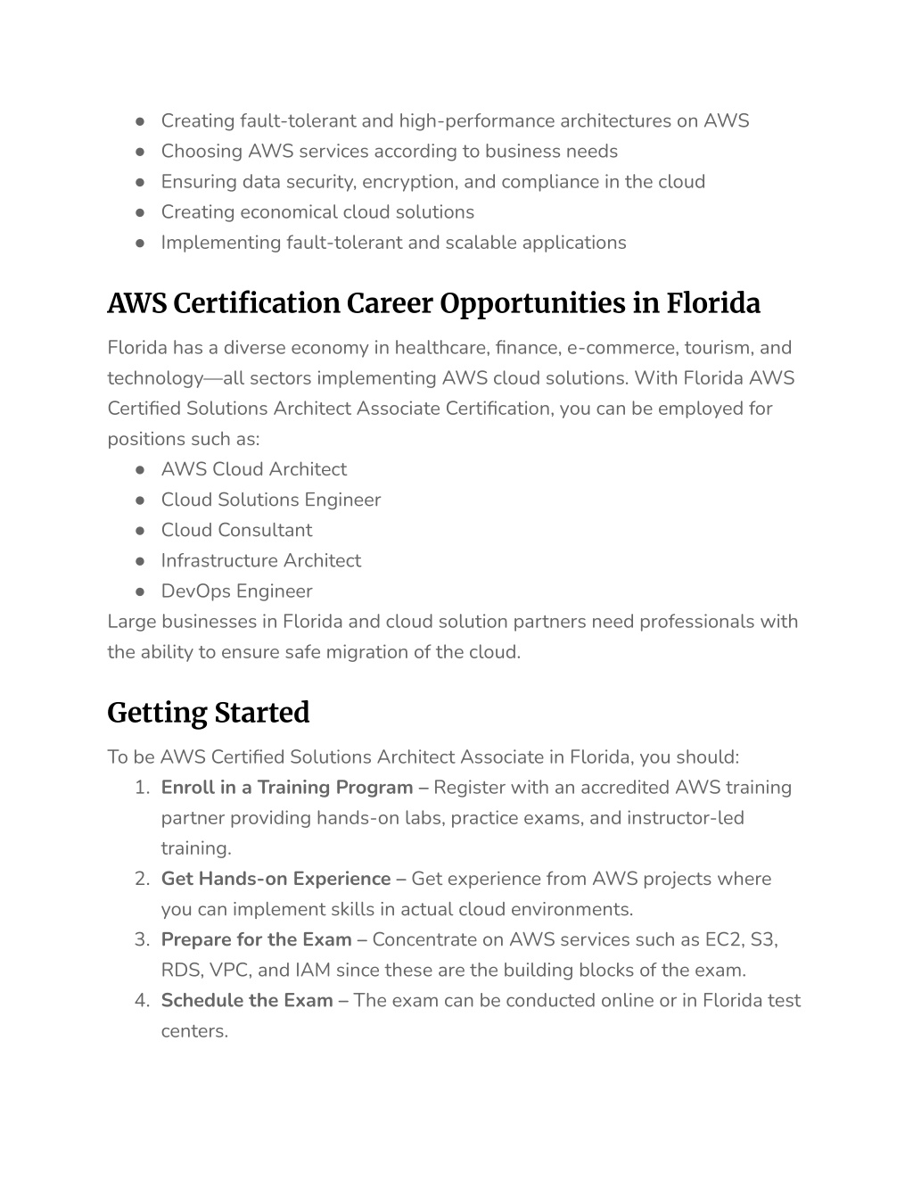 ● Creating fault-tolerant and high-performance architectures on AWS ● Choosing AWS services according to business needs ● Ensuring data security, encryption, and compliance in the cloud ● Creating economical cloud solutions ● Implementing fault-tolerant and scalable applications AWS Certification Career Opportunities in Florida Florida has a diverse economy in healthcare, finance, e-commerce, tourism, and technology—all sectors implementing AWS cloud solutions. With Florida AWS Certified Solutions Architect Associate Certification, you can be employed for positions such as: ● AWS Cloud Architect ● Cloud Solutions Engineer ● Cloud Consultant ● Infrastructure Architect ● DevOps Engineer Large businesses in Florida and cloud solution partners need professionals with the ability to ensure safe migration of the cloud. Getting Started To be AWS Certified Solutions Architect Associate in Florida, you should: 1. Enroll in a Training Program – Register with an accredited AWS training partner providing hands-on labs, practice exams, and instructor-led training. 2. Get Hands-on Experience – Get experience from AWS projects where you can implement skills in actual cloud environments. 3. Prepare for the Exam – Concentrate on AWS services such as EC2, S3, RDS, VPC, and IAM since these are the building blocks of the exam. 4. Schedule the Exam – The exam can be conducted online or in Florida test centers.