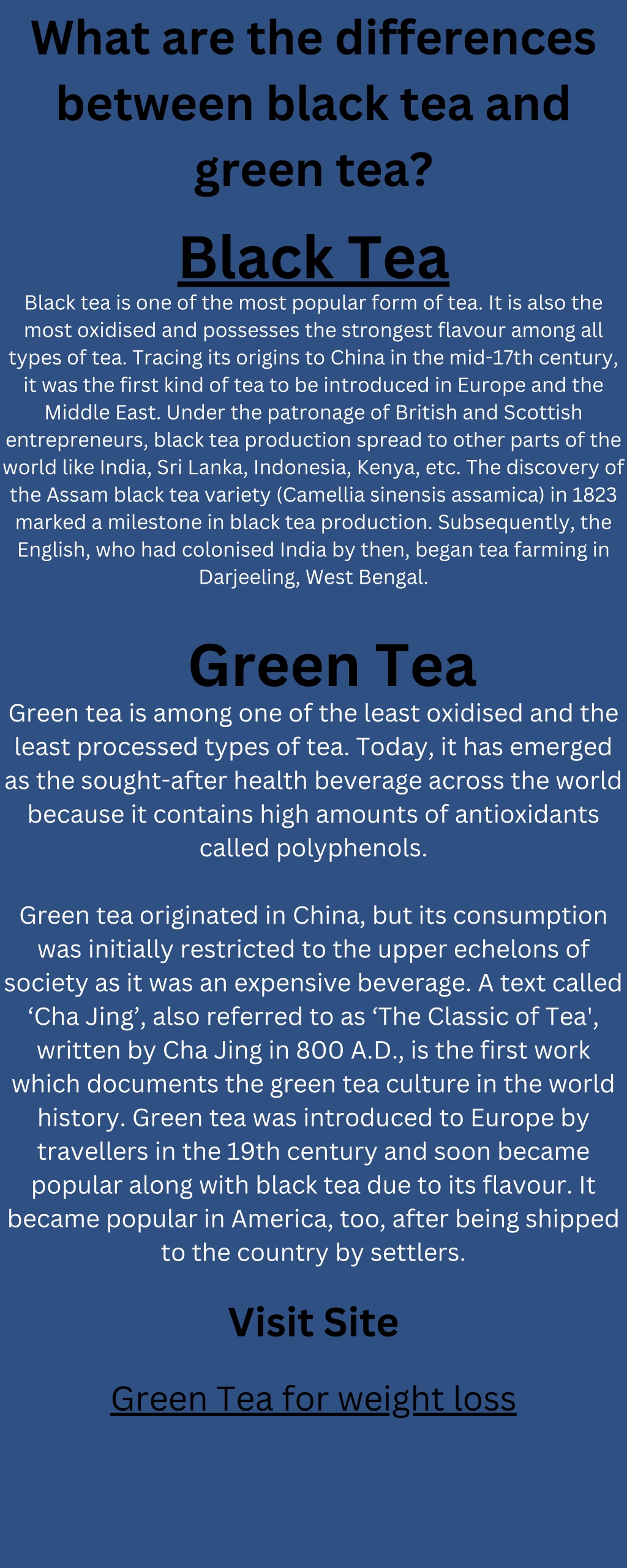 What are the differences between black tea and green tea? Black Tea Black tea is one of the most popular form of tea. It is also the most oxidised and possesses the strongest flavour among all types of tea. Tracing its origins to China in the mid-17th century, it was the first kind of tea to be introduced in Europe and the Middle East. Under the patronage of British and Scottish entrepreneurs, black tea production spread to other parts of the world like India, Sri Lanka, Indonesia, Kenya, etc. The discovery of the Assam black tea variety (Camellia sinensis assamica) in 1823 marked a milestone in black tea production. Subsequently, the English, who had colonised India by then, began tea farming in Darjeeling, West Bengal. Green Tea Green tea is among one of the least oxidised and the least processed types of tea. Today, it has emerged as the sought-after health beverage across the world because it contains high amounts of antioxidants called polyphenols. Green tea originated in China, but its consumption was initially restricted to the upper echelons of society as it was an expensive beverage. A text called ‘Cha Jing’, also referred to as ‘The Classic of Tea', written by Cha Jing in 800 A.D., is the first work which documents the green tea culture in the world history. Green tea was introduced to Europe by travellers in the 19th century and soon became popular along with black tea due to its flavour. It became popular in America, too, after being shipped to the country by settlers. Visit Site Green Tea for weight loss