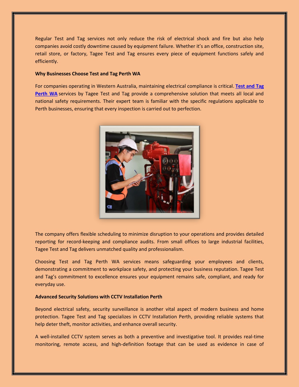 2. Regular Test and Tag services not only reduce the risk of electrical shock and fire but also help companies avoid costly downtime caused by equipment failure. Whether it’s an office, construction site, retail store, or factory, Tagee Test and Tag ensures every piece of equipment functions safely and efficiently. Why Businesses Choose Test and Tag Perth WA For companies operating in Western Australia, maintaining electrical compliance is critical. Test and Tag Perth WA services by Tagee Test and Tag provide a comprehensive solution that meets all local and national safety requirements. Their expert team is familiar with the specific regulations applicable to Perth businesses, ensuring that every inspection is carried out to perfection. The company offers flexible scheduling to minimize disruption to your operations and provides detailed reporting for record-keeping and compliance audits. From small offices to large industrial facilities, Tagee Test and Tag delivers unmatched quality and professionalism. Choosing Test and Tag Perth WA services means safeguarding your employees and clients, demonstrating a commitment to workplace safety, and protecting your business reputation. Tagee Test and Tag’s commitment to excellence ensures your equipment remains safe, compliant, and ready for everyday use. Advanced Security Solutions with CCTV Installation Perth Beyond electrical safety, security surveillance is another vital aspect of modern business and home protection. Tagee Test and Tag specializes in CCTV Installation Perth, providing reliable systems that help deter theft, monitor activities, and enhance overall security. A well-installed CCTV system serves as both a preventive and investigative tool. It provides real-time monitoring, remote access, and high-definition footage that can be used as evidence in case of