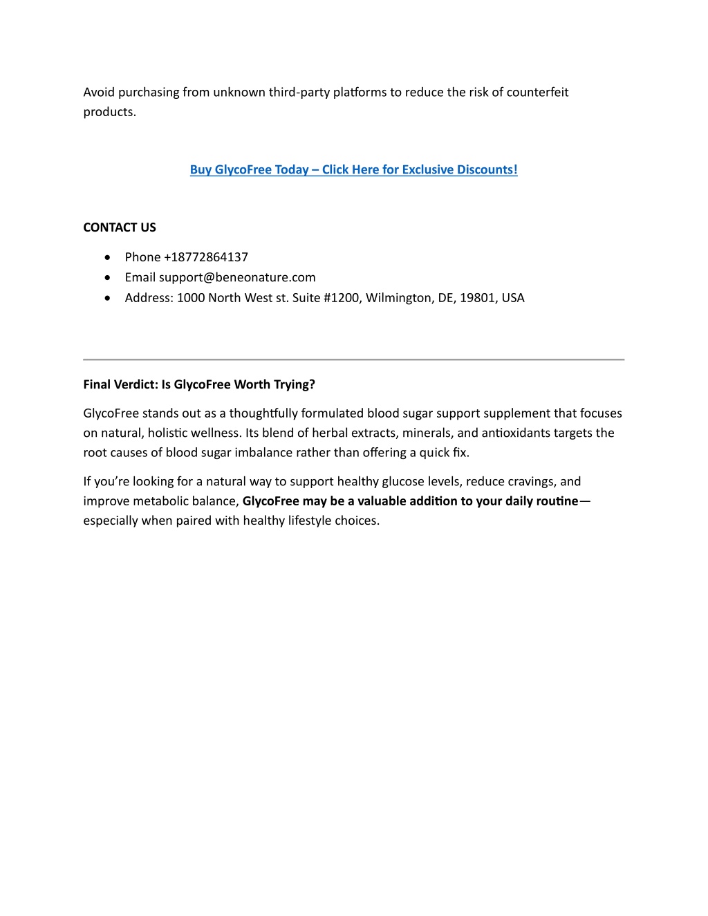Avoid purchasing from unknown third-party platgorms to reduce the risk of counterfeit products. Buy GlycoFree Today – Click Here for Exclusive Discounts! CONTACT US •Phone +18772864137 •Email support@beneonature.com •Address: 1000 North West st. Suite #1200, Wilmington, DE, 19801, USA Final Verdict: Is GlycoFree Worth Trying? GlycoFree stands out as a thoughtgully formulated blood sugar support supplement that focuses on natural, holistjc wellness. Its blend of herbal extracts, minerals, and antjoxidants targets the root causes of blood sugar imbalance rather than ofgering a quick fjx. If you’re looking for a natural way to support healthy glucose levels, reduce cravings, and improve metabolic balance, GlycoFree may be a valuable additjon to your daily routjne— especially when paired with healthy lifestyle choices.