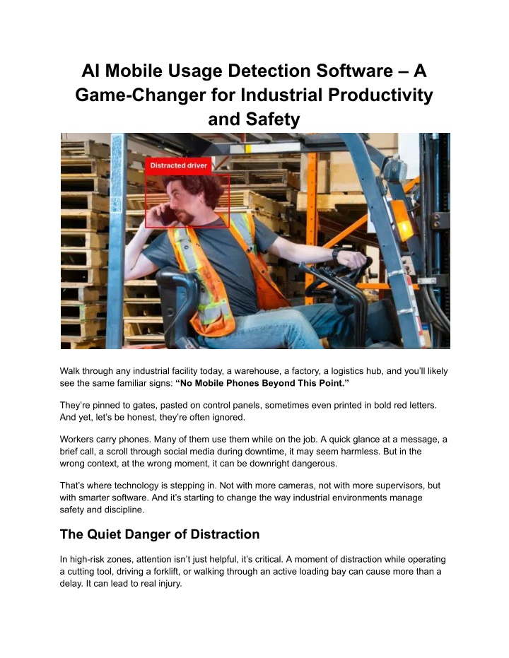 1. AI Mobile Usage Detection Software – A Game-Changer for Industrial Productivity and Safety Walk through any industrial facility today, a warehouse, a factory, a logistics hub, and you’ll likely see the same familiar signs: “No Mobile Phones Beyond This Point.” They’re pinned to gates, pasted on control panels, sometimes even printed in bold red letters. And yet, let’s be honest, they’re often ignored. Workers carry phones. Many of them use them while on the job. A quick glance at a message, a brief call, a scroll through social media during downtime, it may seem harmless. But in the wrong context, at the wrong moment, it can be downright dangerous. That’s where technology is stepping in. Not with more cameras, not with more supervisors, but with smarter software. And it’s starting to change the way industrial environments manage safety and discipline. The Quiet Danger of Distraction In high-risk zones, attention isn’t just helpful, it’s critical. A moment of distraction while operating a cutting tool, driving a forklift, or walking through an active loading bay can cause more than a delay. It can lead to real injury.