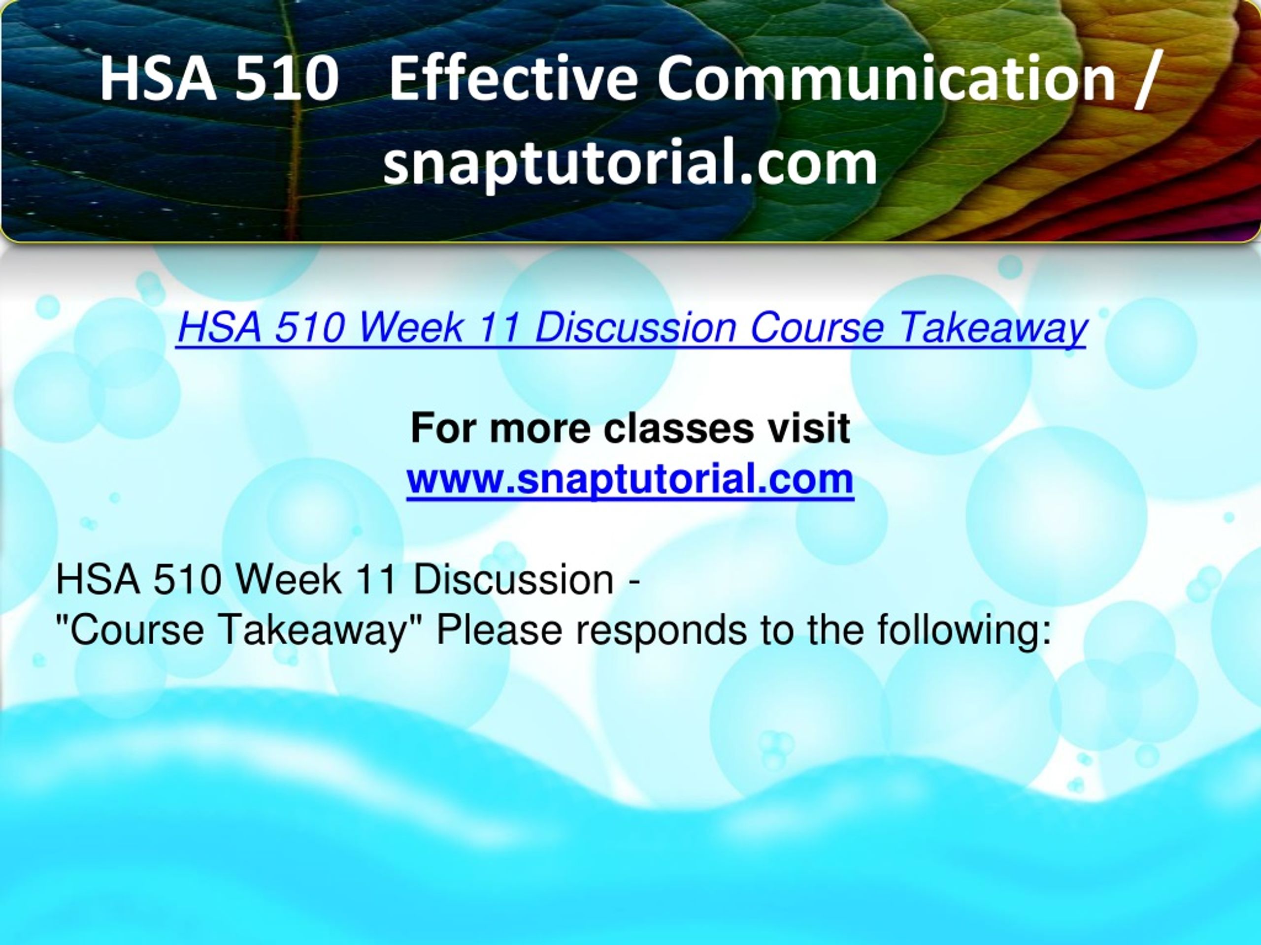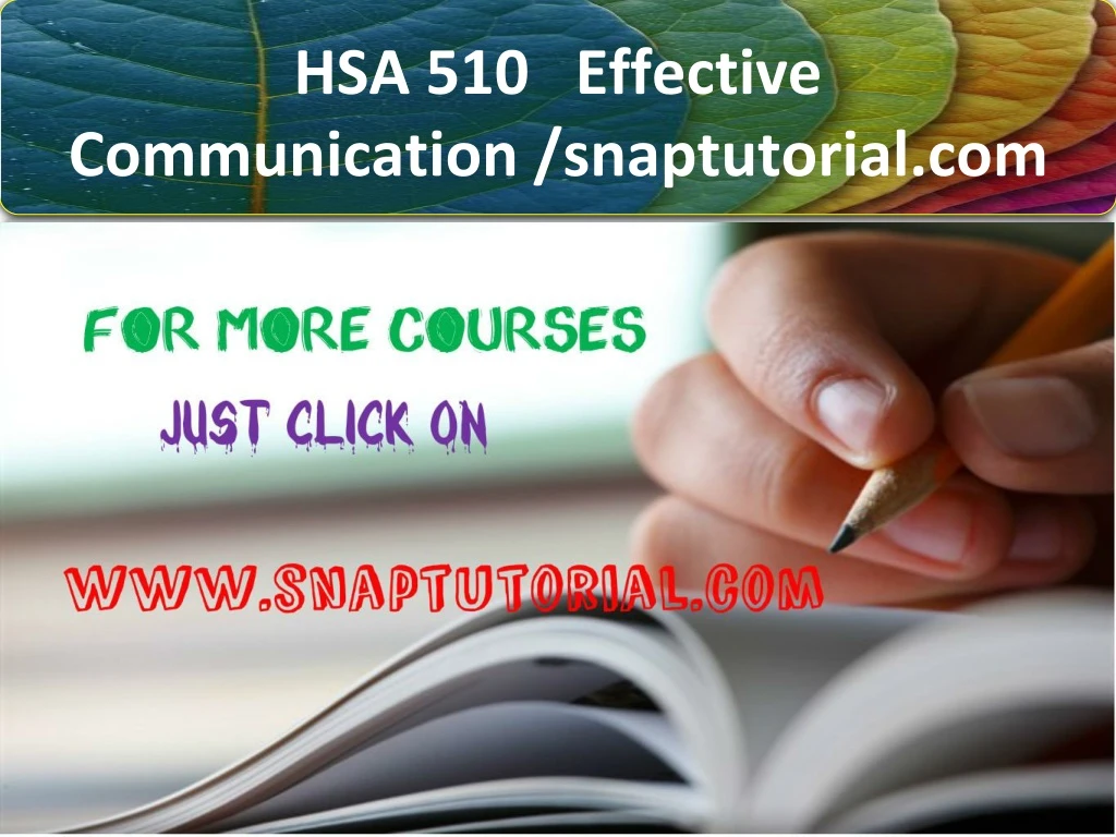 HSA 510 Effective Communication / snaptutorial.com HSA 510 Week 11 Discussion Course Takeaway For more classes visit www.snaptutorial.com HSA 510 Week 11 Discussion - "Course Takeaway" Please responds to the following: