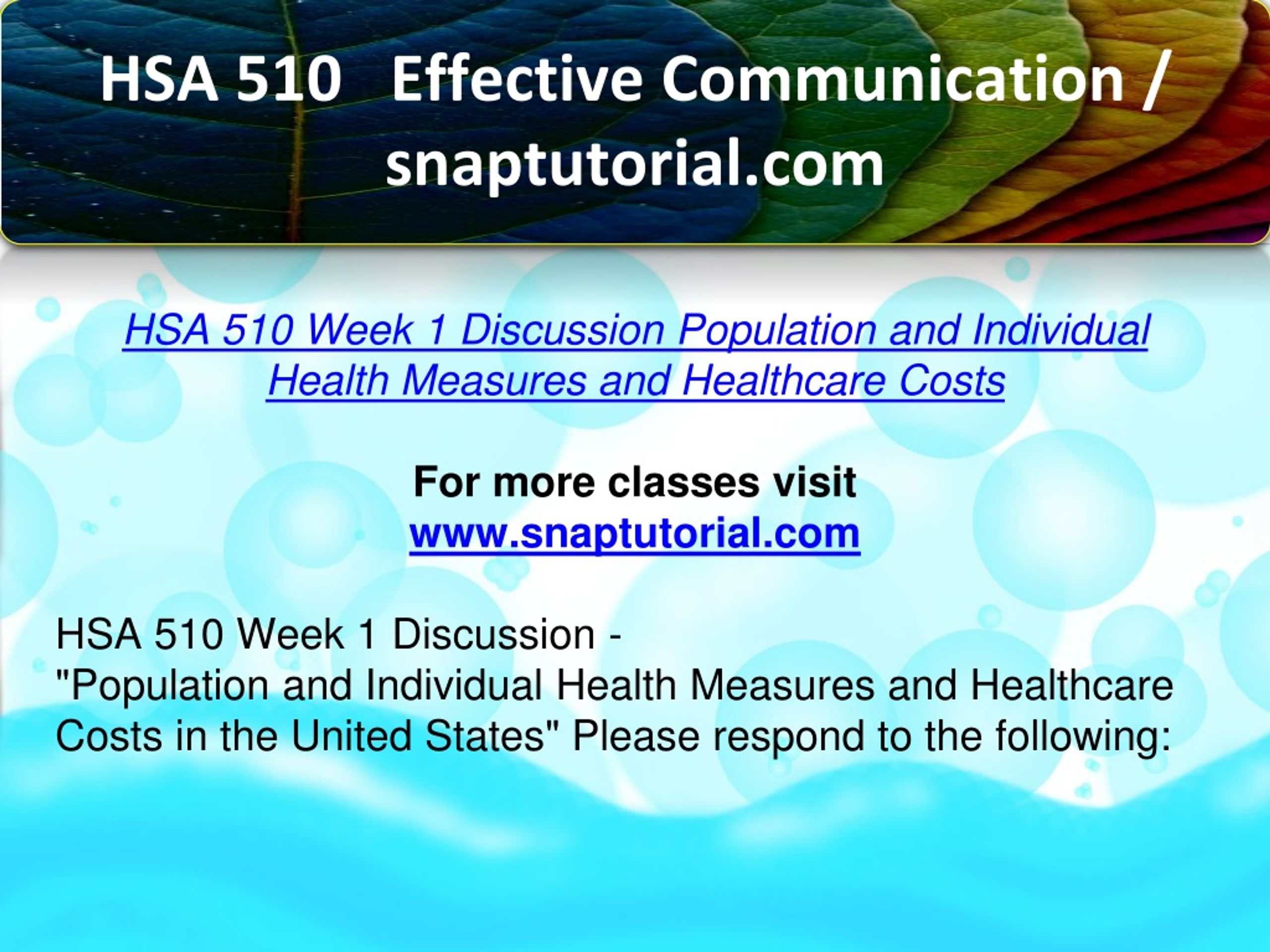 HSA 510 Effective Communication / snaptutorial.com HSA 510 Week 1 Discussion Population and Individual Health Measures and Healthcare Costs For more classes visit www.snaptutorial.com HSA 510 Week 1 Discussion - "Population and Individual Health Measures and Healthcare Costs in the United States" Please respond to the following: