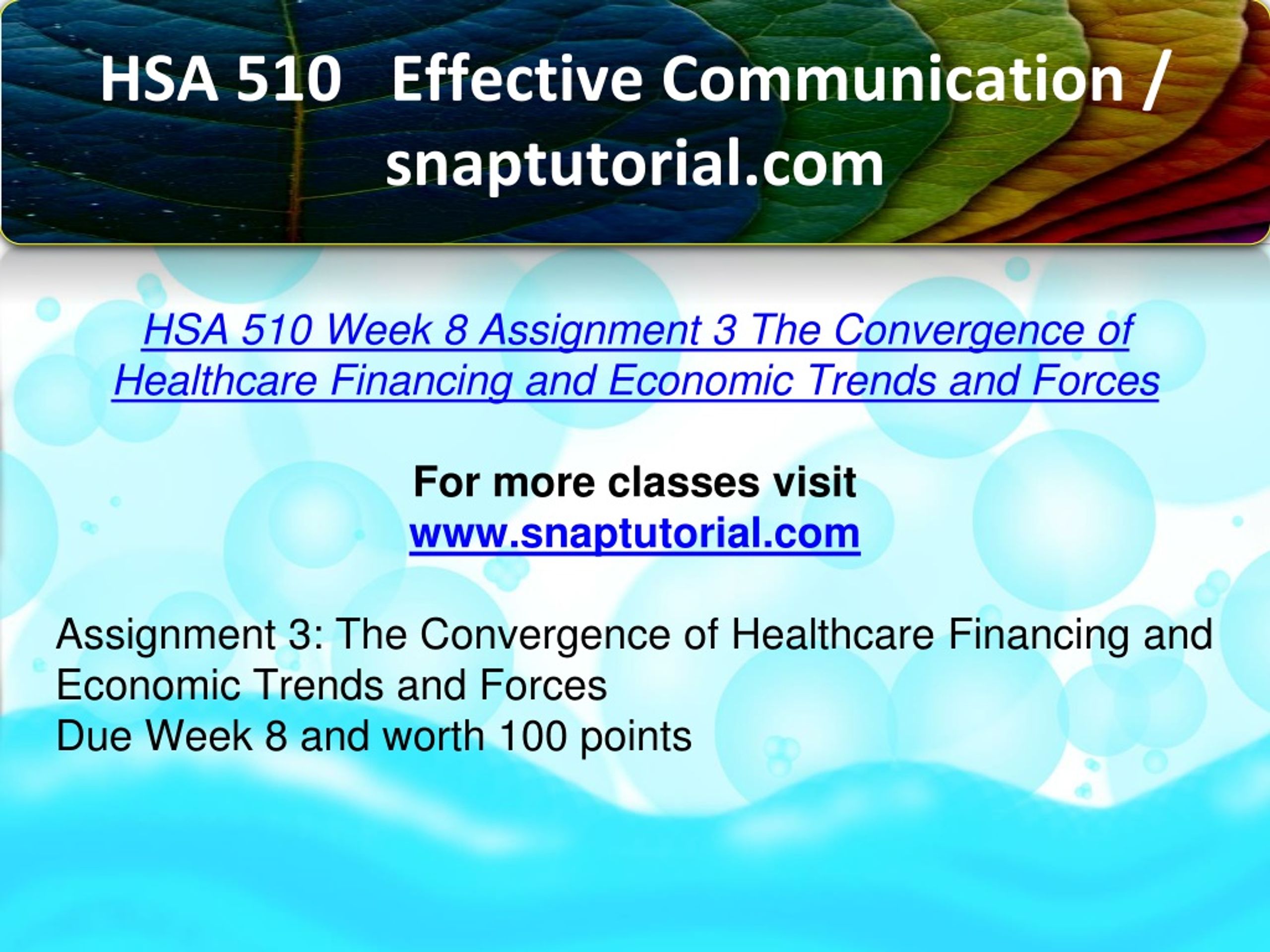 HSA 510 Effective Communication / snaptutorial.com HSA 510 Week 8 Assignment 3 The Convergence of Healthcare Financing and Economic Trends and Forces For more classes visit www.snaptutorial.com Assignment 3: The Convergence of Healthcare Financing and Economic Trends and Forces Due Week 8 and worth 100 points