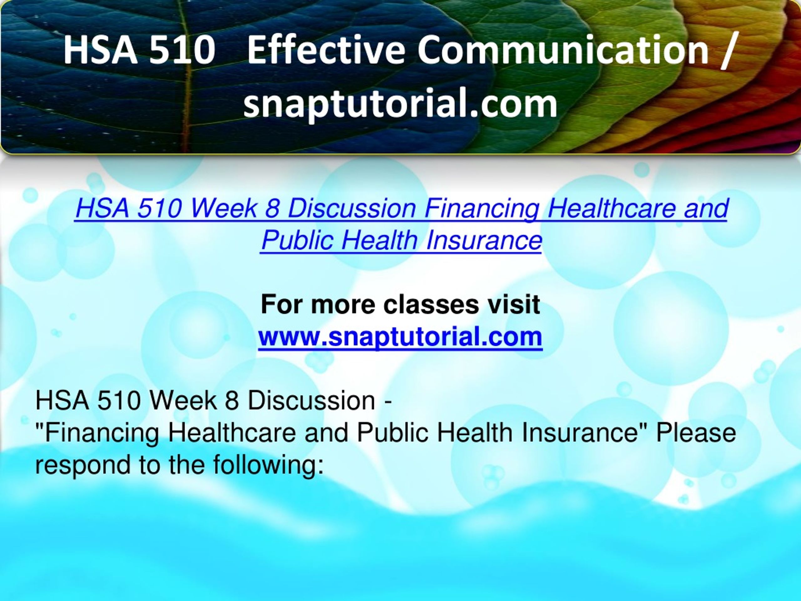 HSA 510 Effective Communication / snaptutorial.com HSA 510 Week 8 Discussion Financing Healthcare and Public Health Insurance For more classes visit www.snaptutorial.com HSA 510 Week 8 Discussion - "Financing Healthcare and Public Health Insurance" Please respond to the following: