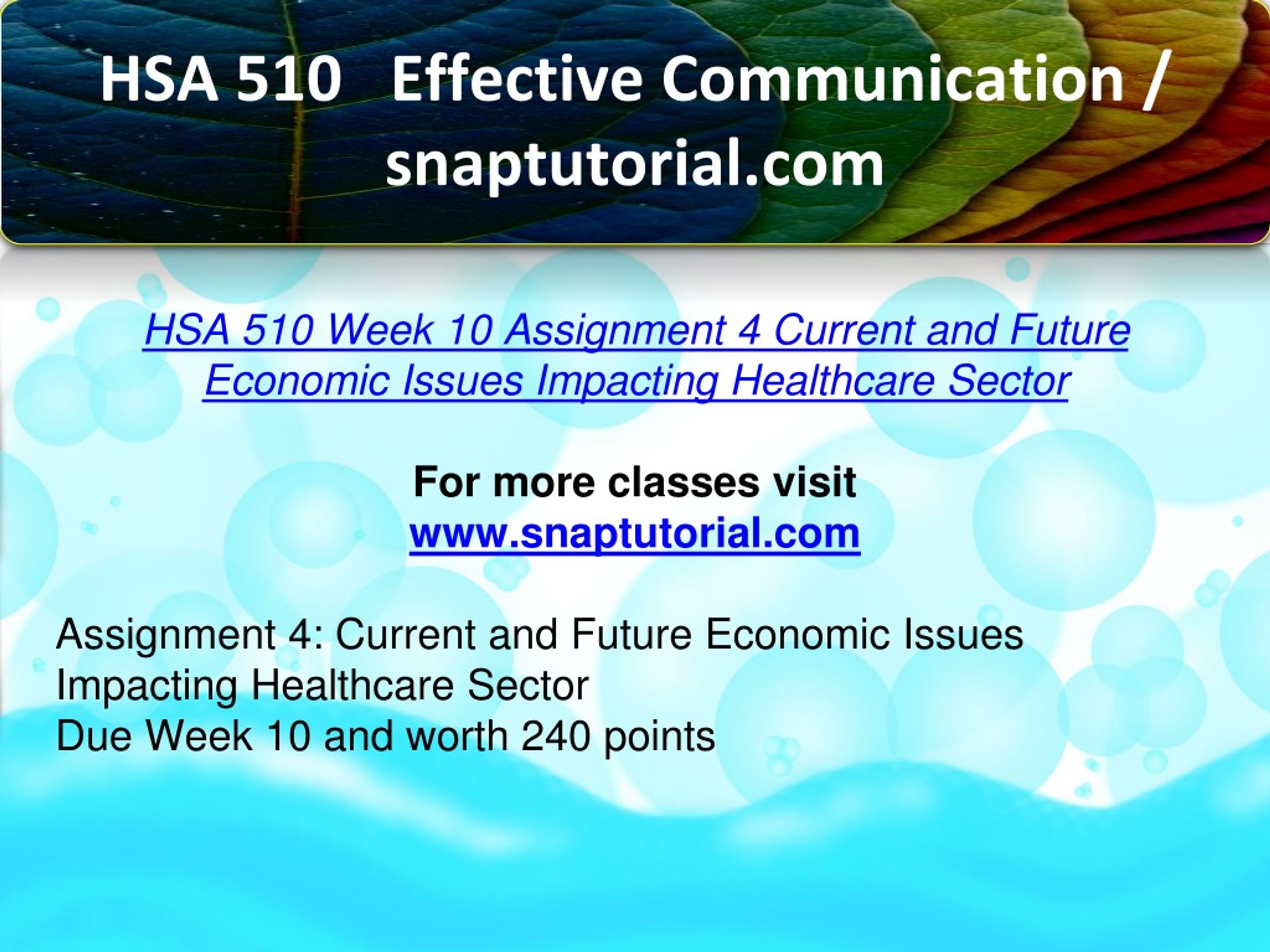 HSA 510 Effective Communication / snaptutorial.com HSA 510 Week 10 Assignment 4 Current and Future Economic Issues Impacting Healthcare Sector For more classes visit www.snaptutorial.com Assignment 4: Current and Future Economic Issues Impacting Healthcare Sector Due Week 10 and worth 240 points