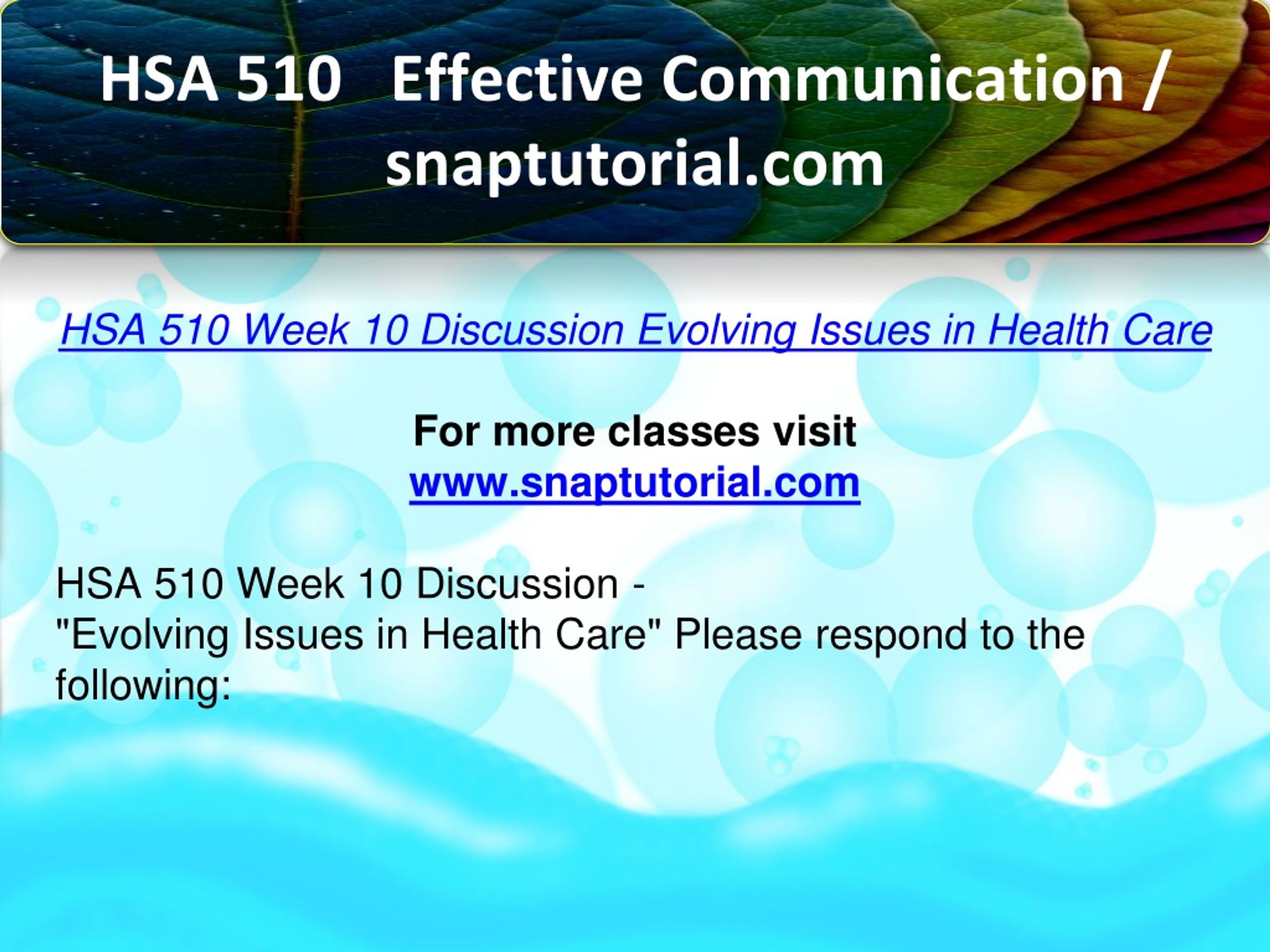 HSA 510 Effective Communication / snaptutorial.com HSA 510 Week 10 Discussion Evolving Issues in Health Care For more classes visit www.snaptutorial.com HSA 510 Week 10 Discussion - "Evolving Issues in Health Care" Please respond to the following: