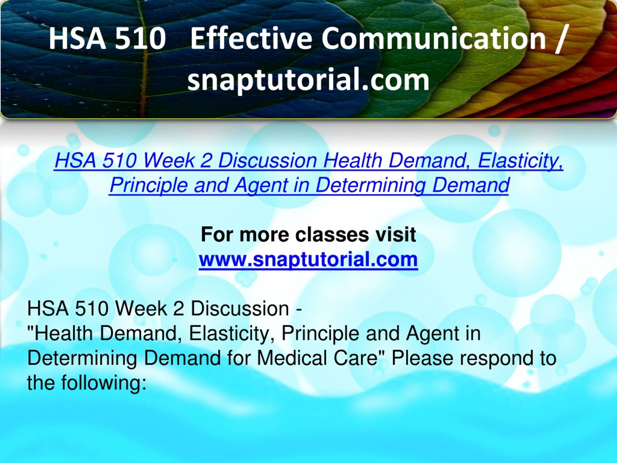 HSA 510 Effective Communication / snaptutorial.com HSA 510 Week 2 Discussion Health Demand, Elasticity, Principle and Agent in Determining Demand For more classes visit www.snaptutorial.com HSA 510 Week 2 Discussion - "Health Demand, Elasticity, Principle and Agent in Determining Demand for Medical Care" Please respond to the following: