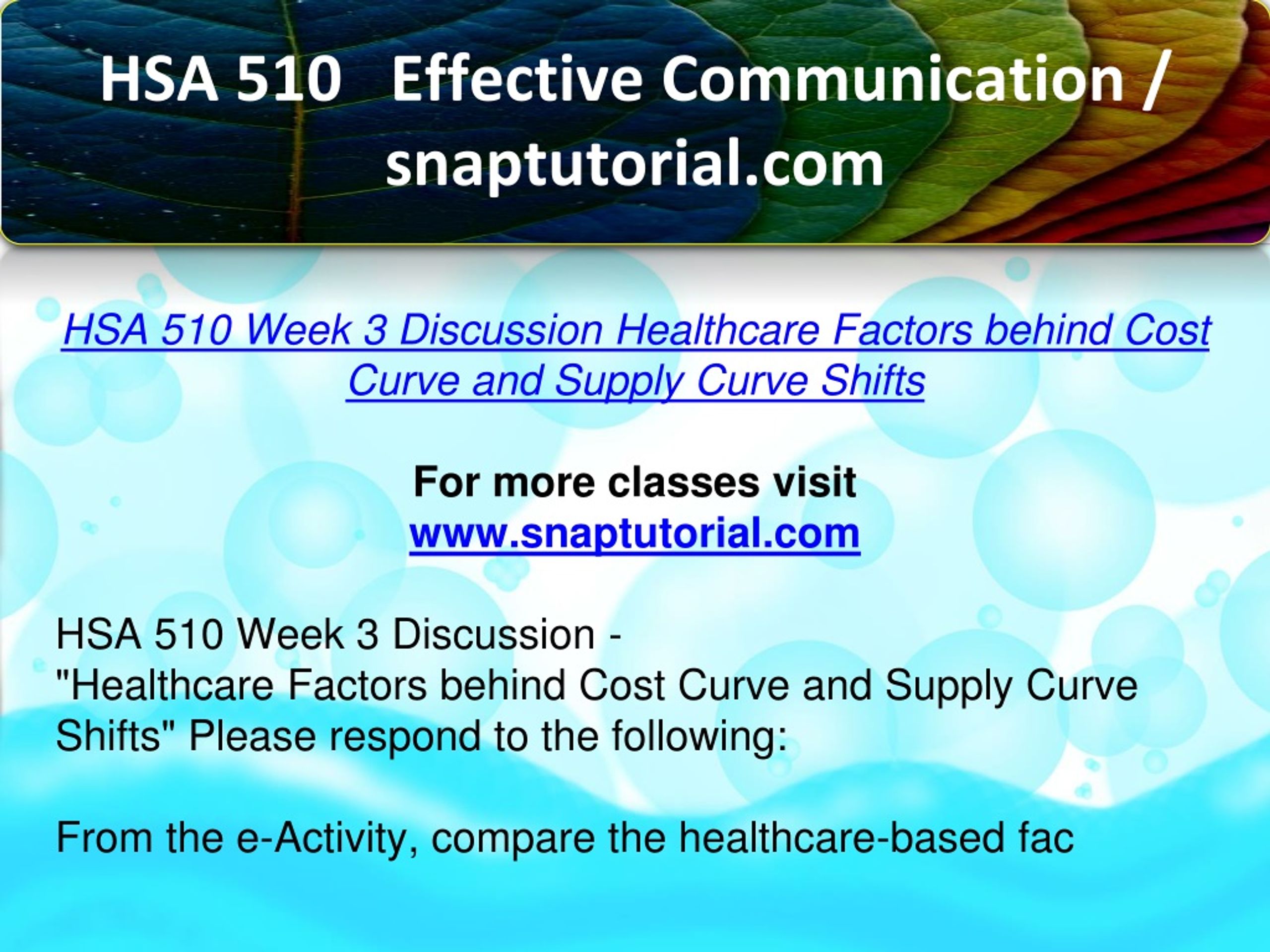 HSA 510 Effective Communication / snaptutorial.com HSA 510 Week 3 Discussion Healthcare Factors behind Cost Curve and Supply Curve Shifts For more classes visit www.snaptutorial.com HSA 510 Week 3 Discussion - "Healthcare Factors behind Cost Curve and Supply Curve Shifts" Please respond to the following: From the e-Activity, compare the healthcare-based fac