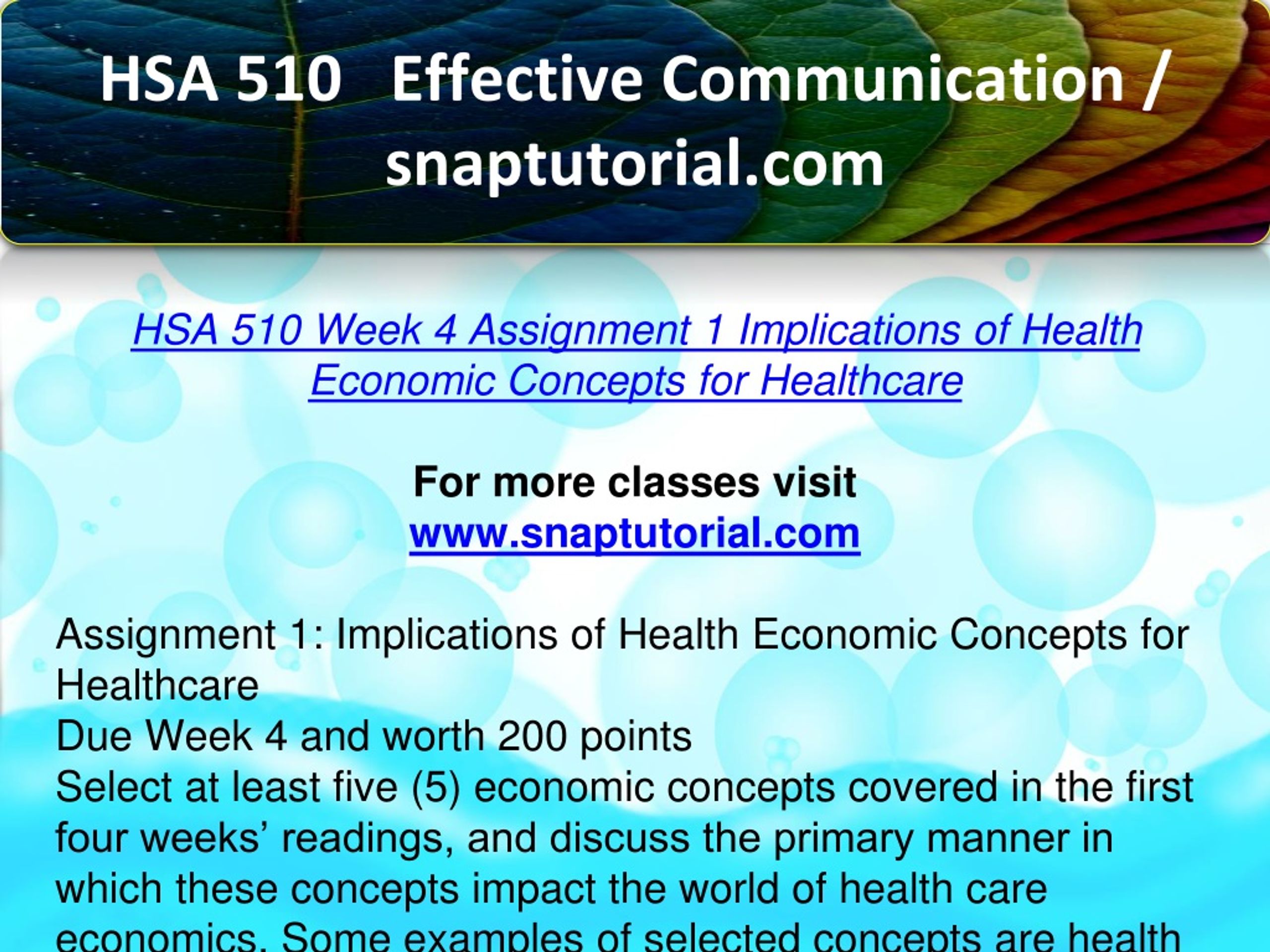 HSA 510 Effective Communication / snaptutorial.com HSA 510 Week 4 Assignment 1 Implications of Health Economic Concepts for Healthcare For more classes visit www.snaptutorial.com Assignment 1: Implications of Health Economic Concepts for Healthcare Due Week 4 and worth 200 points Select at least five (5) economic concepts covered in the first four weeks’ readings, and discuss the primary manner in which these concepts impact the world of health care economics. Some examples of selected concepts are health