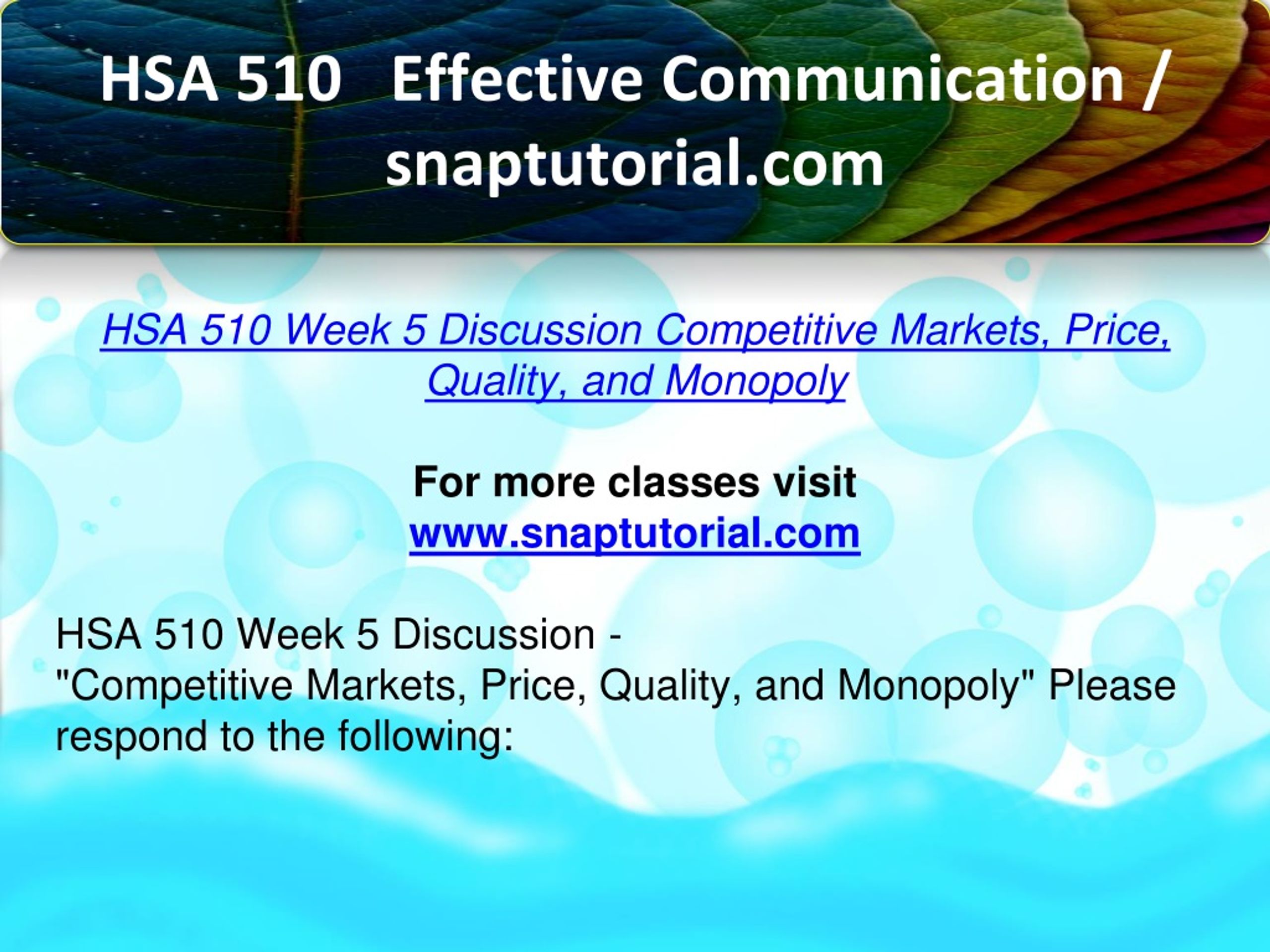 HSA 510 Effective Communication / snaptutorial.com HSA 510 Week 5 Discussion Competitive Markets, Price, Quality, and Monopoly For more classes visit www.snaptutorial.com HSA 510 Week 5 Discussion - "Competitive Markets, Price, Quality, and Monopoly" Please respond to the following: