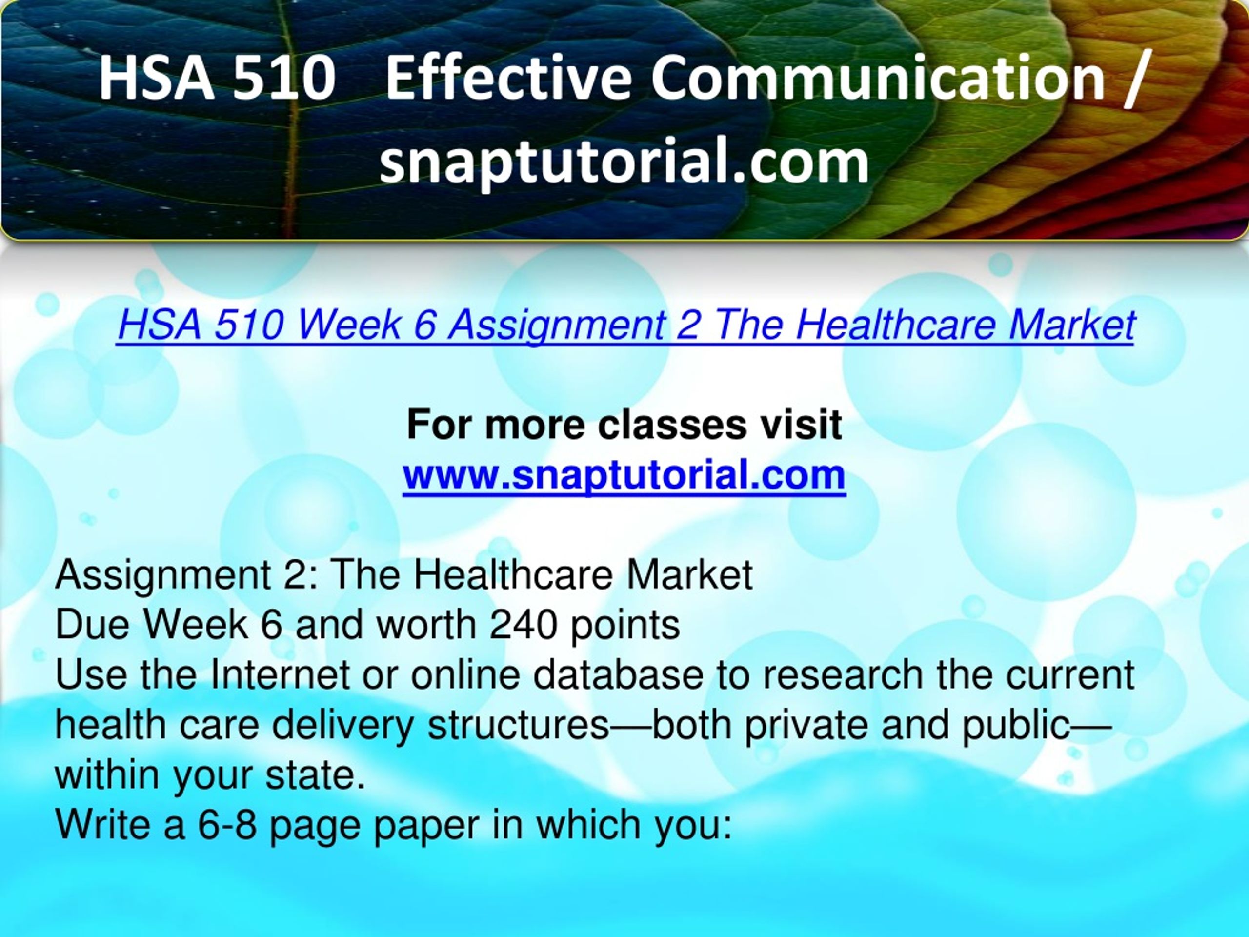 HSA 510 Effective Communication / snaptutorial.com HSA 510 Week 6 Assignment 2 The Healthcare Market For more classes visit www.snaptutorial.com Assignment 2: The Healthcare Market Due Week 6 and worth 240 points Use the Internet or online database to research the current health care delivery structures—both private and public—within your state. Write a 6-8 page paper in which you: