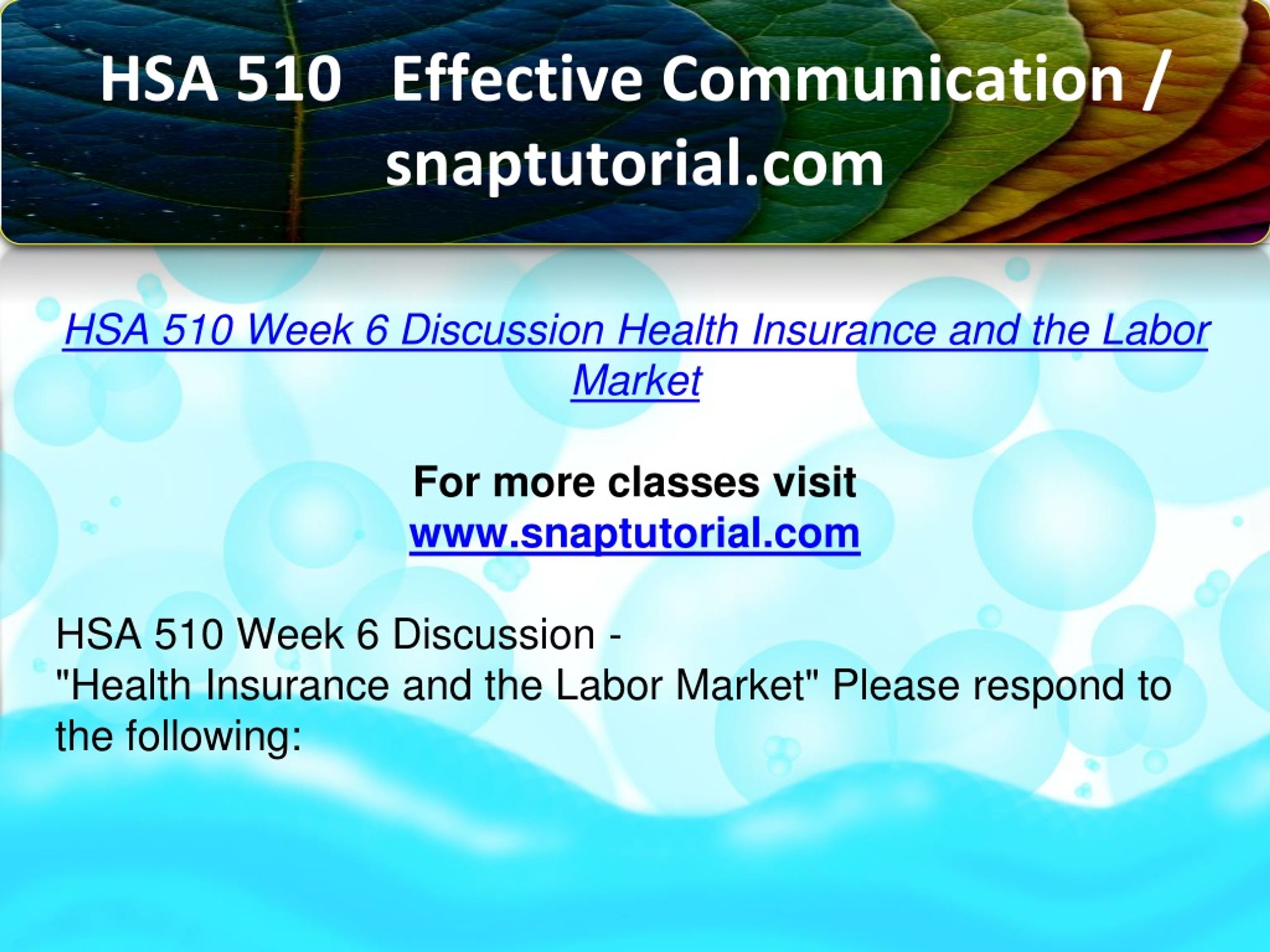 HSA 510 Effective Communication / snaptutorial.com HSA 510 Week 6 Discussion Health Insurance and the Labor Market For more classes visit www.snaptutorial.com HSA 510 Week 6 Discussion - "Health Insurance and the Labor Market" Please respond to the following: