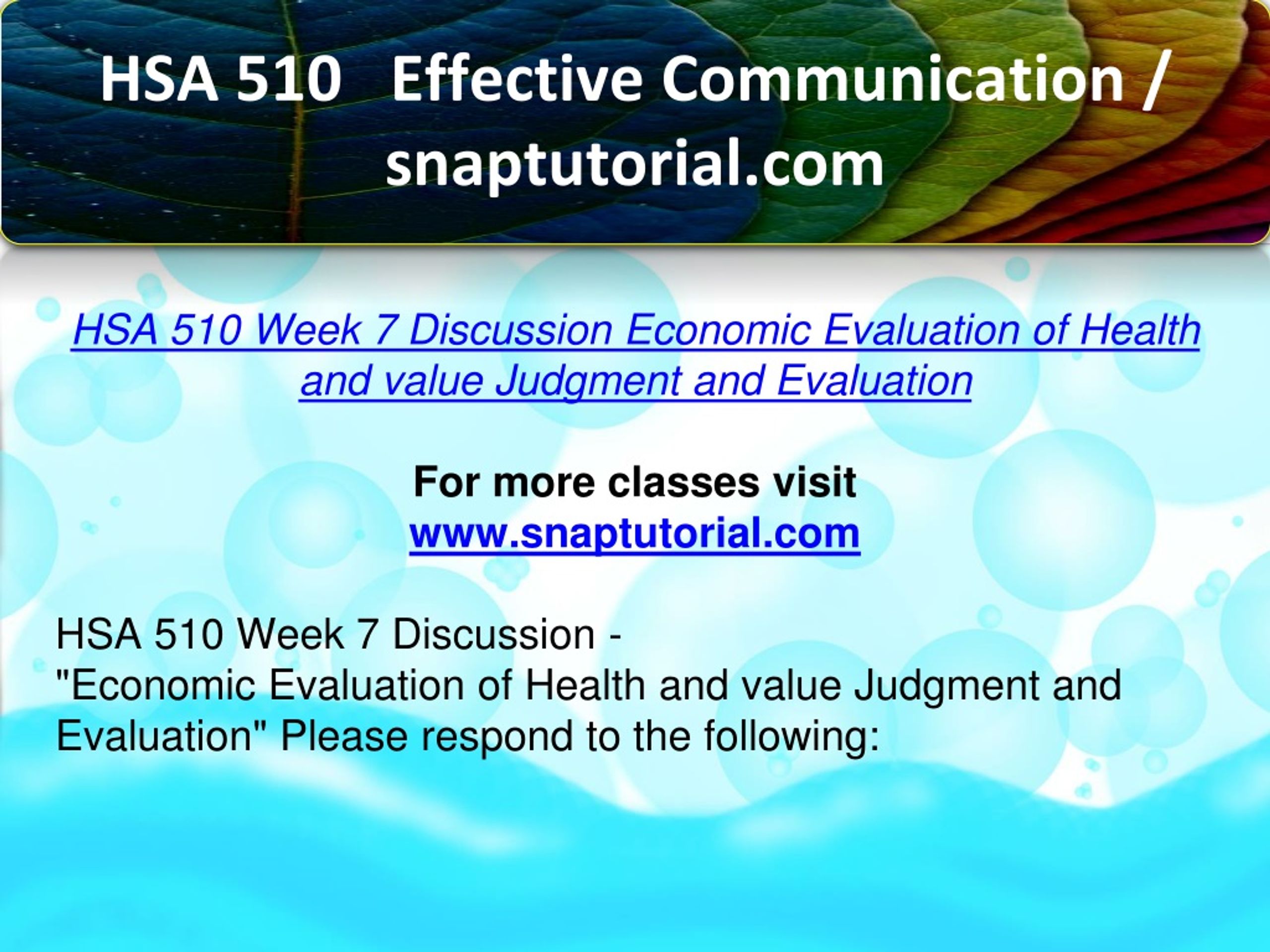 HSA 510 Effective Communication / snaptutorial.com HSA 510 Week 7 Discussion Economic Evaluation of Health and value Judgment and Evaluation For more classes visit www.snaptutorial.com HSA 510 Week 7 Discussion - "Economic Evaluation of Health and value Judgment and Evaluation" Please respond to the following: