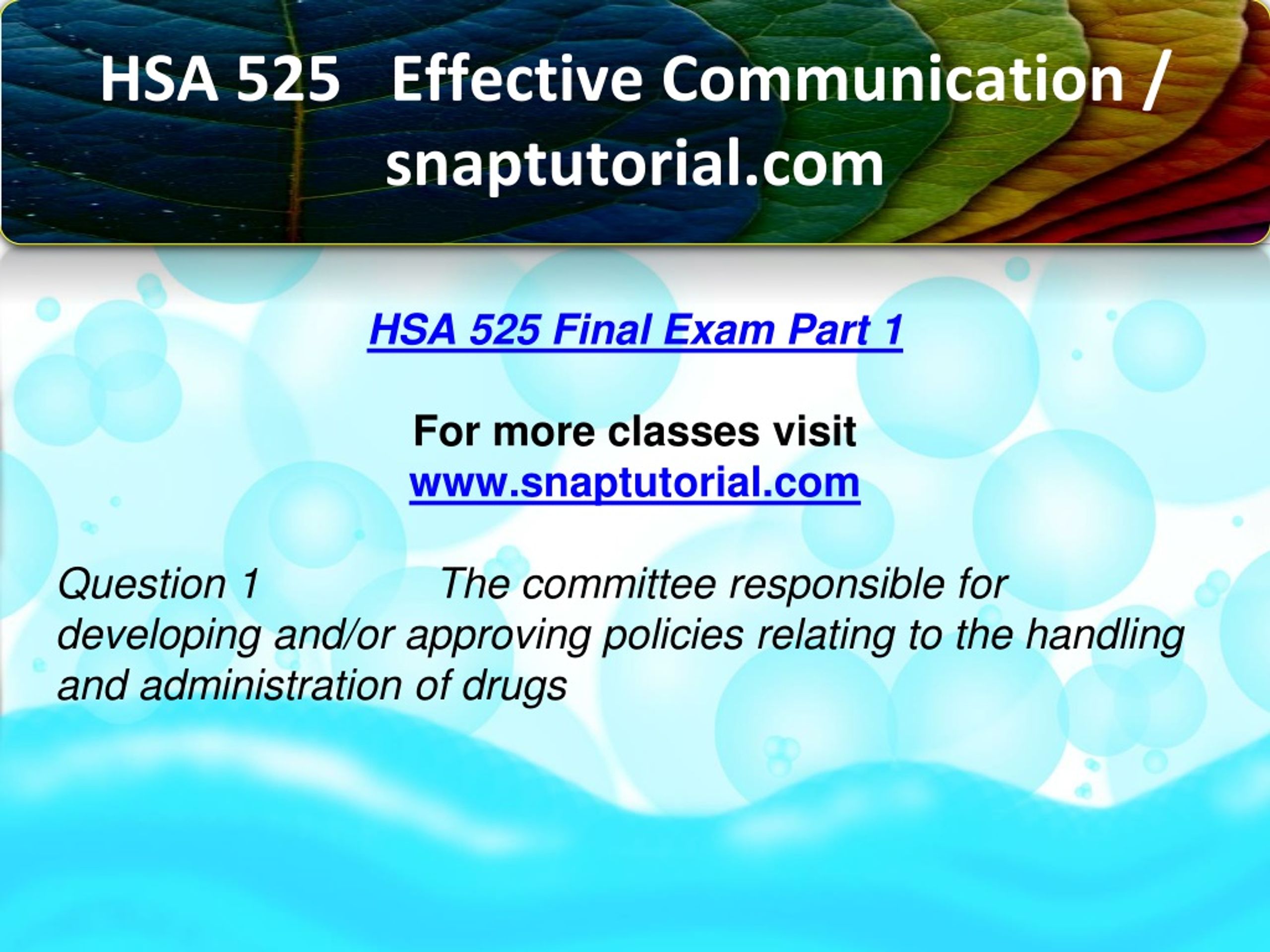 HSA 525 Effective Communication / snaptutorial.com HSA 525 Final Exam Part 1 For more classes visit www.snaptutorial.com Question 1 The committee responsible for developing and/or approving policies relating to the handling and administration of drugs