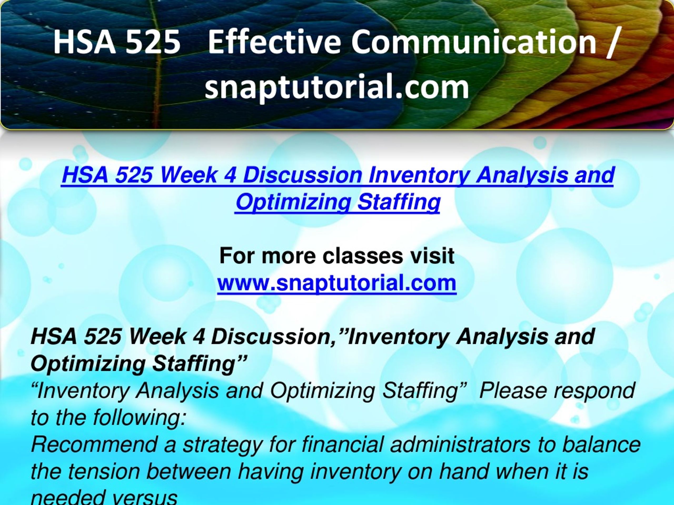 HSA 525 Effective Communication / snaptutorial.com • HSA 525 Week 4 Discussion Inventory Analysis and Optimizing Staffing • For more classes visit • www.snaptutorial.com • HSA 525 Week 4 Discussion,”Inventory Analysis and Optimizing Staffing” • “Inventory Analysis and Optimizing Staffing” Please respond to the following: • Recommend a strategy for financial administrators to balance the tension between having inventory on hand when it is needed versus