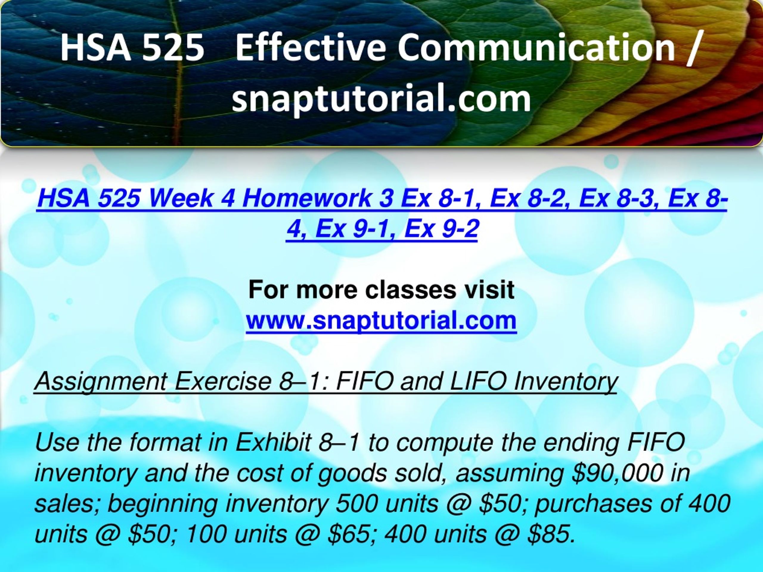 HSA 525 Effective Communication / snaptutorial.com HSA 525 Week 4 Homework 3 Ex 8-1, Ex 8-2, Ex 8-3, Ex 8-4, Ex 9-1, Ex 9-2 For more classes visit www.snaptutorial.com Assignment Exercise 8–1: FIFO and LIFO Inventory Use the format in Exhibit 8–1 to compute the ending FIFO inventory and the cost of goods sold, assuming $90,000 in sales; beginning inventory 500 units @ $50; purchases of 400 units @ $50; 100 units @ $65; 400 units @ $85.