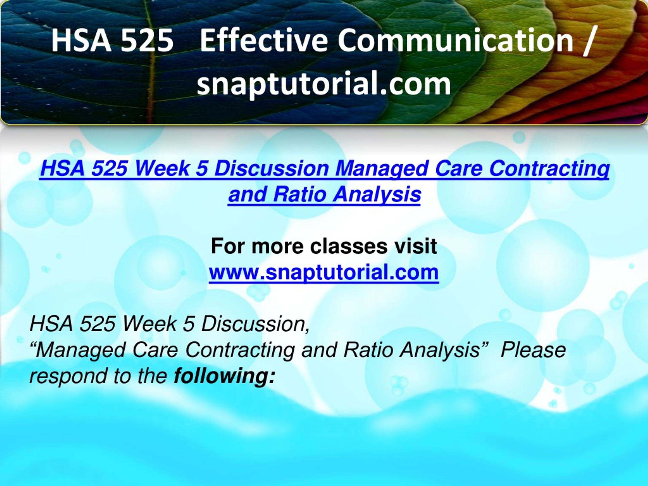 HSA 525 Effective Communication / snaptutorial.com HSA 525 Week 5 Discussion Managed Care Contracting and Ratio Analysis For more classes visit www.snaptutorial.com HSA 525 Week 5 Discussion, “Managed Care Contracting and Ratio Analysis” Please respond to the following: